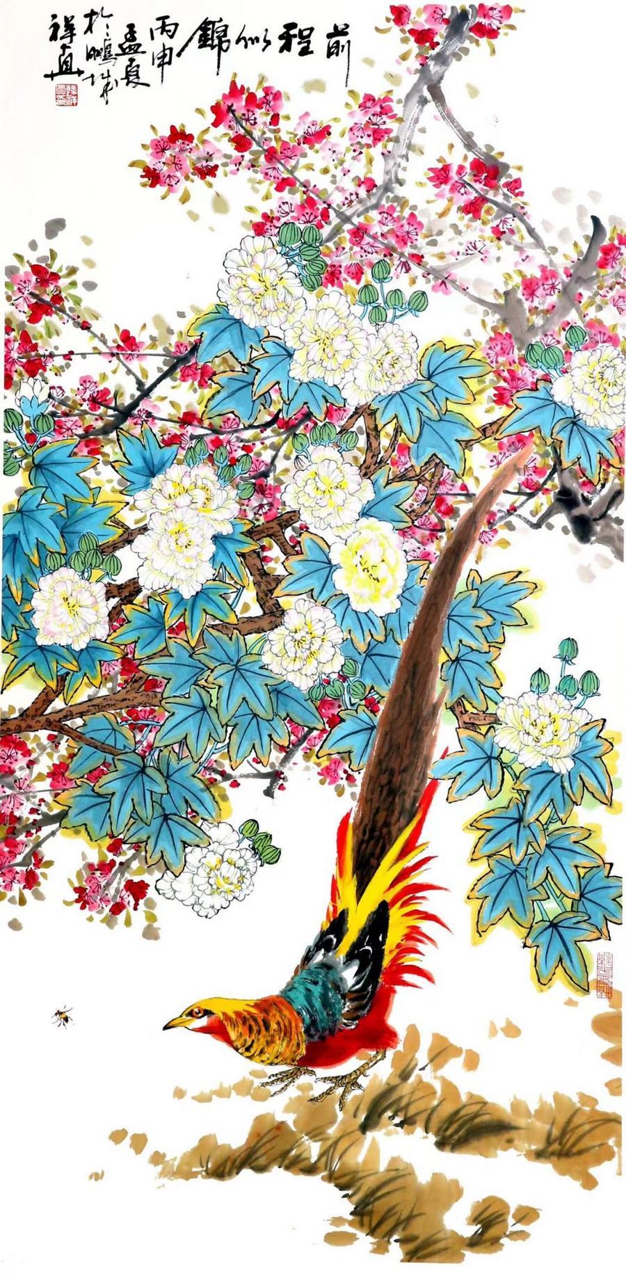 创作意境:锦鸡,谐音“金鸡”,在古代是吉祥、富贵的象征。这些正体现了儒家倡导的“五常”,即仁、义、礼、智、信。作品中,玉芙蓉和桃花竞相绽放,锦鸡自信而立,让人感受到一种:“暮春初夏日,万物共生长”的感觉。