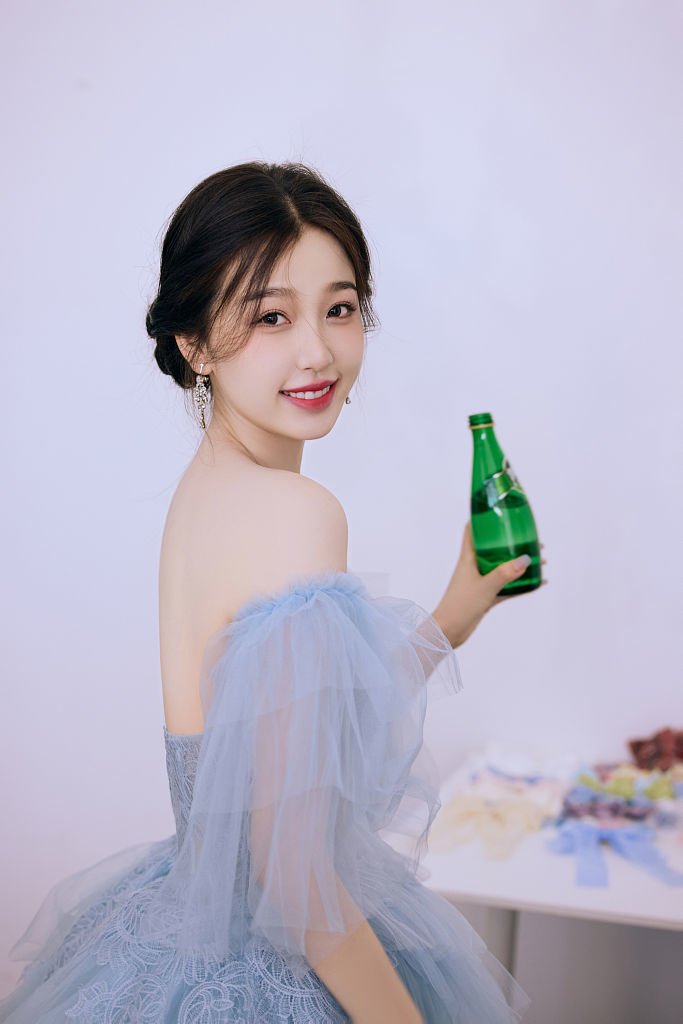 虞书欣穿浅蓝色抹胸裙秀完美天鹅颈 配红唇露美背迷人又可爱