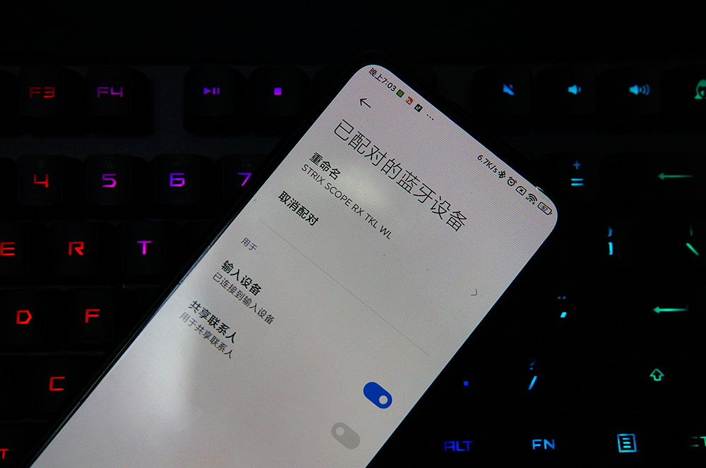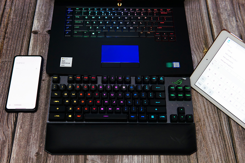 而且ROG 游侠RX TKL可以同时连接到多台设备上,比如我除了电脑之外,还连接到ipad和手机上,需要打字时先切换到对应的设备,然后马上就可以无缝输入,完全感觉不到延迟。