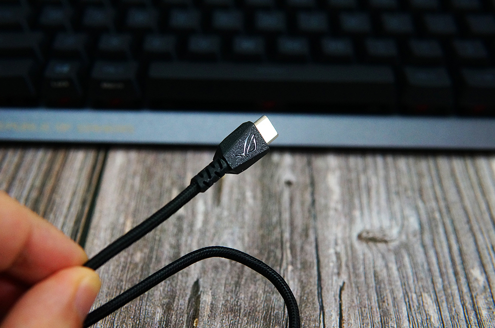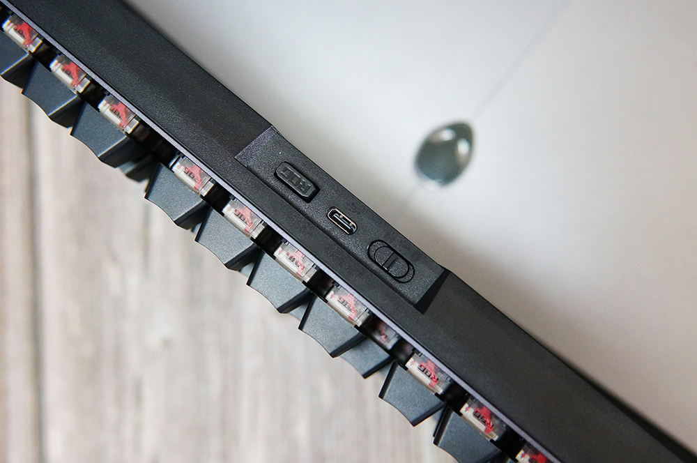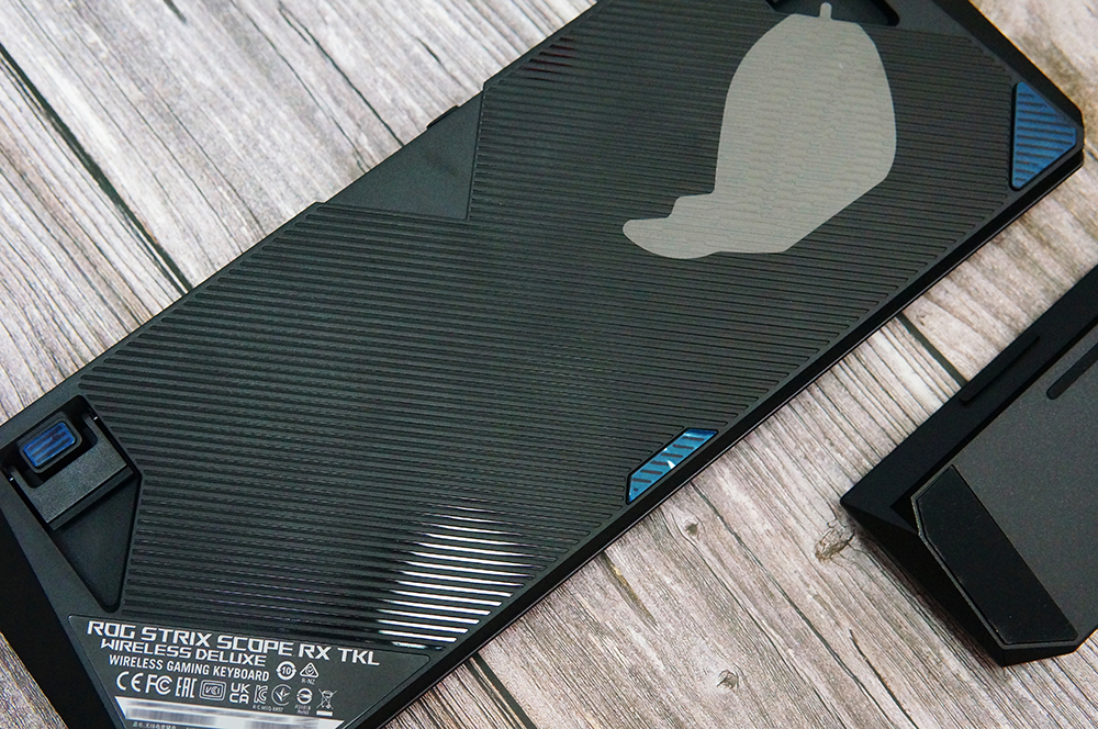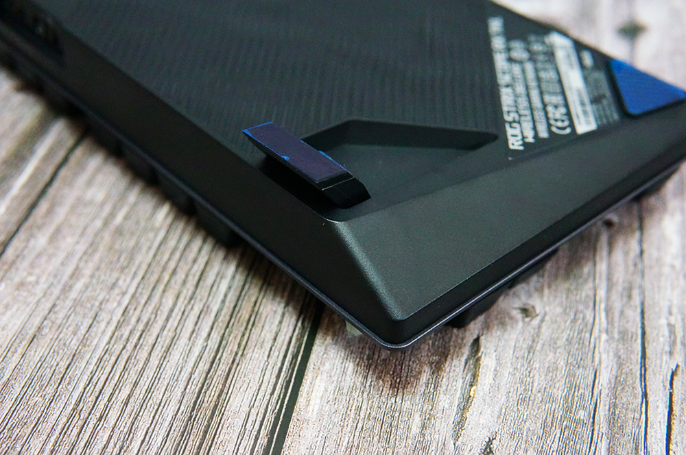 ROG 游侠RX TKL机械键盘支持有线和无线两种连接方式,它的有线接口采用的是时下最为流行的TYPE-C,两侧分别是模式切换开关和无线接收器收纳槽。