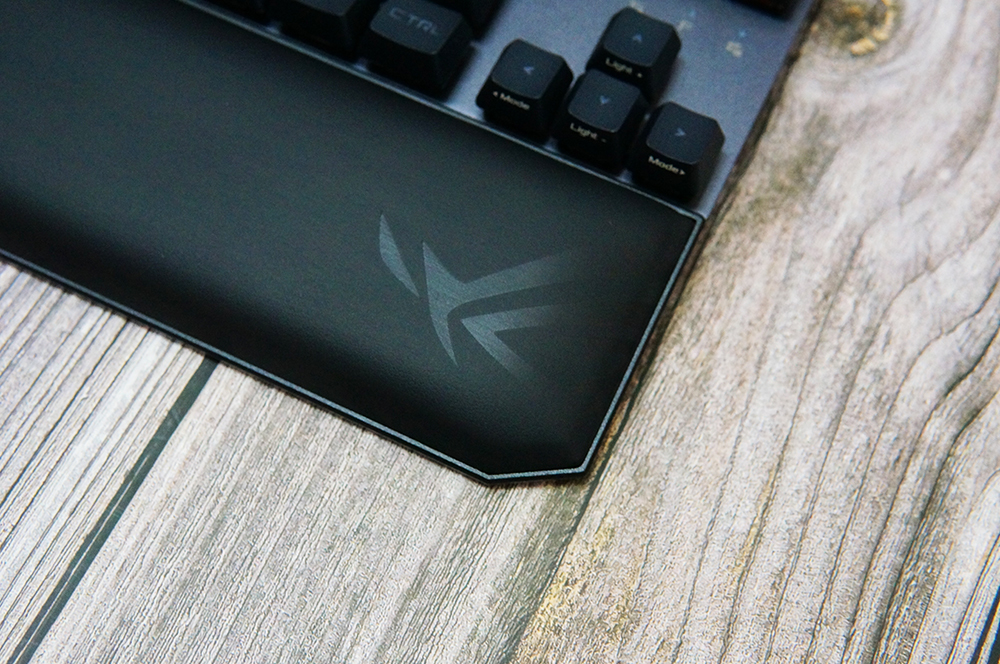 ROG附带的掌托采用磁吸设计,只需轻轻靠近键盘下沿,便可自动精准对位,这个掌托的表面为皮质材质,手放在上面有轻微弹性,感觉特别舒适。