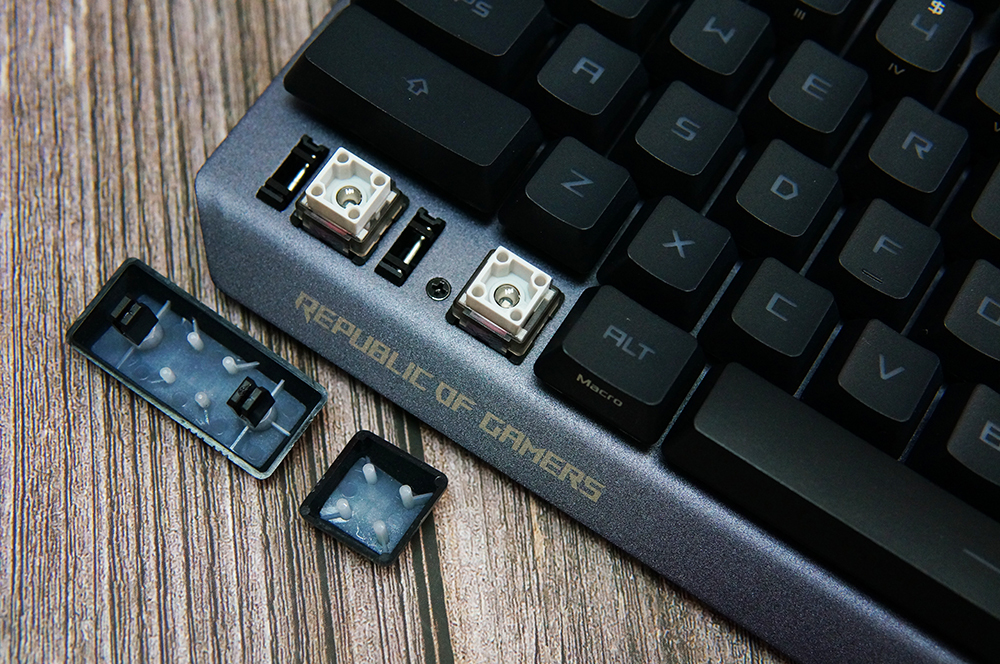 对于机械键盘来说,轴体是最为关键的部分,下面我们将键帽取下来看看。ROG 游侠RX TKL机械键盘采用的是著名的RX轴体。在外形上和很多机械轴都有明显不同,方形火山口结构可以带来更稳定的手感,无论按在键盘的哪一部分都能够稳定按下并触发。此外,四角固定插座也是能够减少键帽的晃动的。至于中间的X结构稳定器,则可以保证在触发是无抖动,确保一直的敲击感。