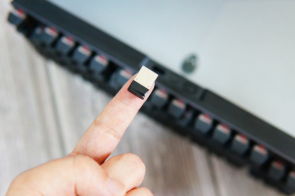 这个无线接收器实在太小了,只有指尖那么点,有了专门的收纳位,才不容易丢失。