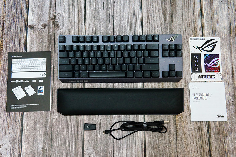 下面来看看键盘的外观,ROG 游侠RX TKL的外形尺寸为356×136×39mm,由于采用的是84键的设计,没有独立的数字键盘,所以整体显得十分小巧,不过产品的净重竟然达到了1059g,可以说分量十足。