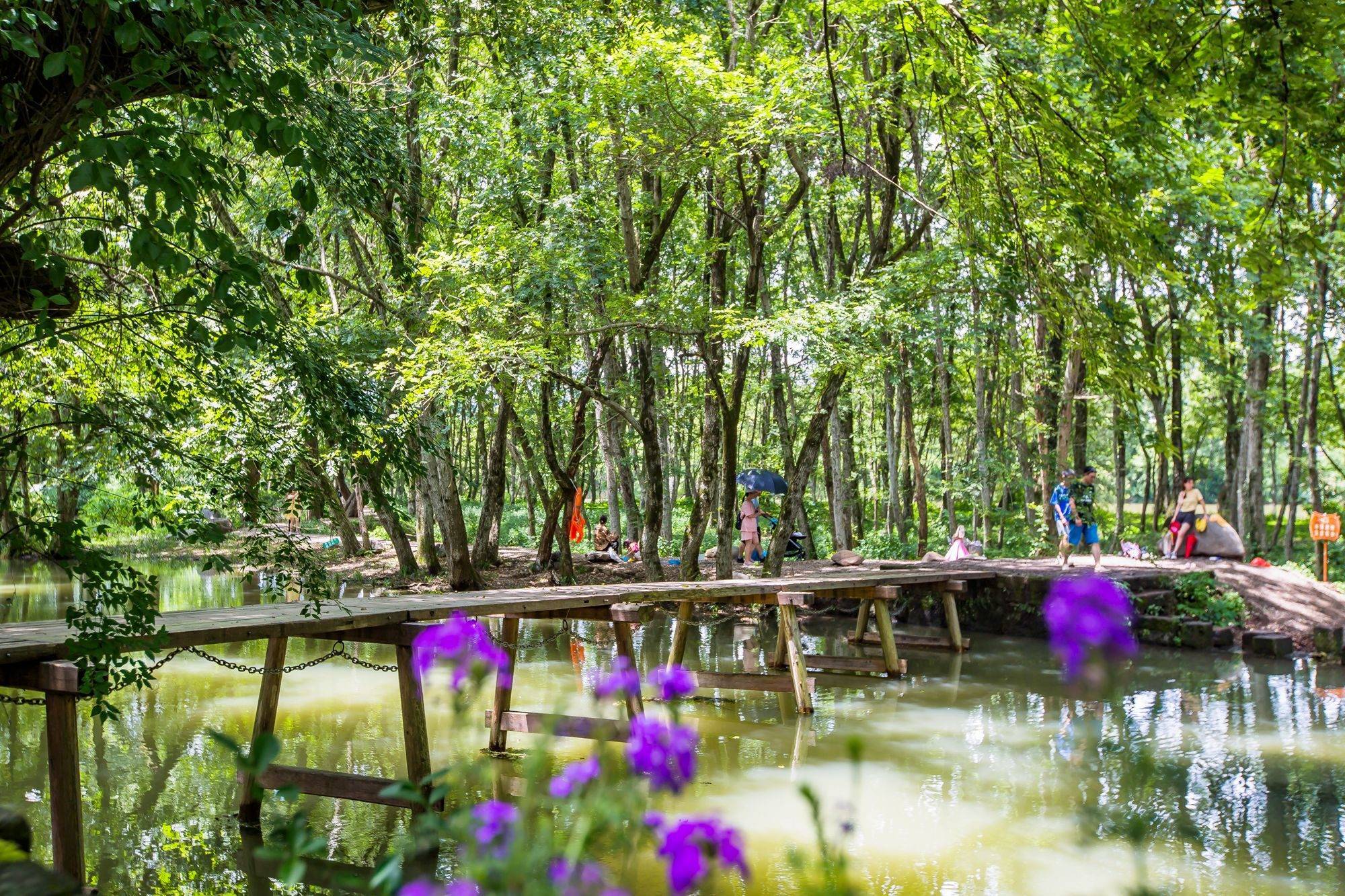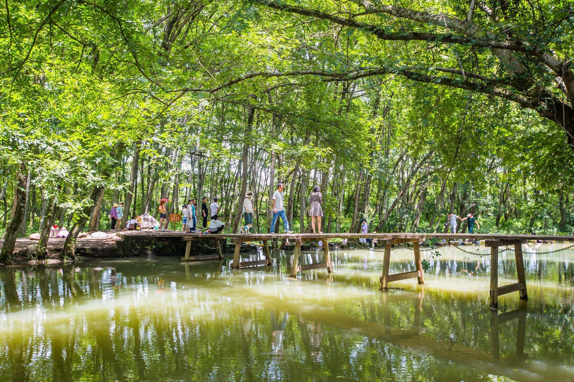畅游在村中,清新的空气扑面而来,满目的绿意让人身心舒爽。走上简易而充满野趣的木桥,碧绿的河水从桥下流过,郁郁葱葱的树林彷佛遮盖了整个夏天的燥热。