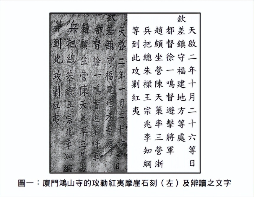 至于明军方面的兵力,则好考察得多。查厦门鸿山寺的攻剿红夷摩崖石刻上的文字-“天启二年十月二十六等日,钦差镇守福建地方等处都督徐一鸣督游击将军赵颇,坐营陈天策,率三营浙兵把总朱梁,王宗兆,李知纲等到此攻剿红夷。” 也就是说,明军兵力为三营浙兵。