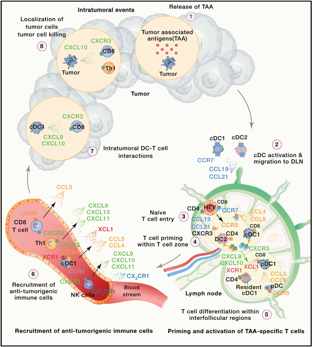 3. CCR7:介导cDC1和cDC2细胞从肿瘤向TDLN迁移,启动T细胞的效应功能。