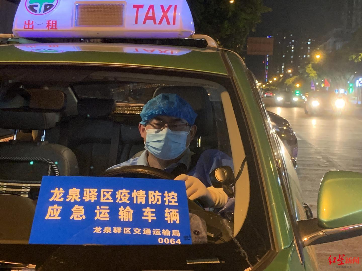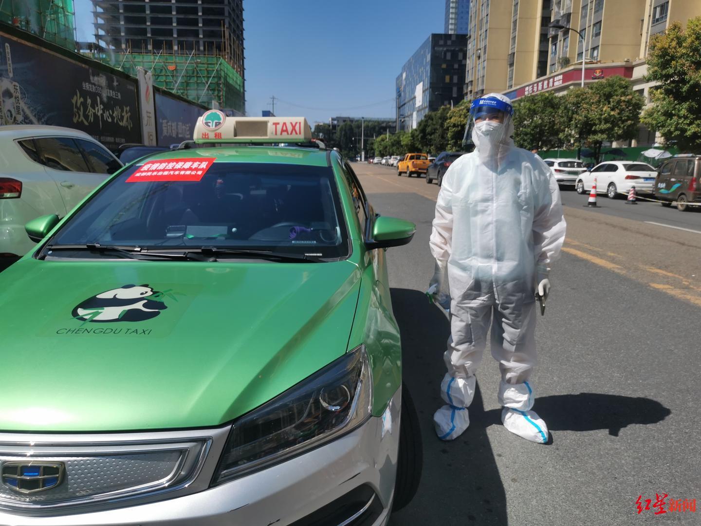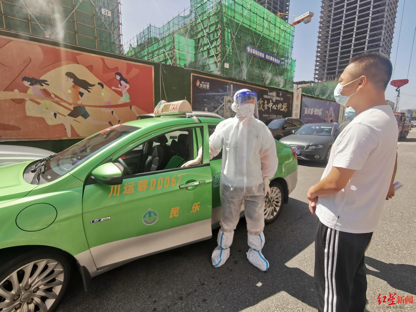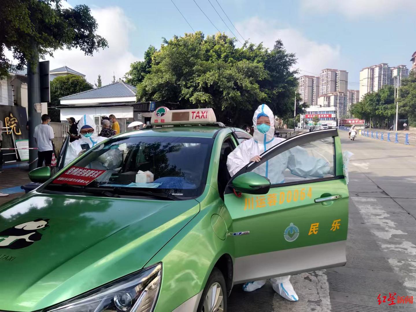 7月23日上午10点半,在成都市龙泉驿区驿都城小区门口,黎洪勇开着出租车将该隔离小区外出就医的人员安全送回来,在与社区工作人员交接好后,他又接到新任务赶赴下一个点位。