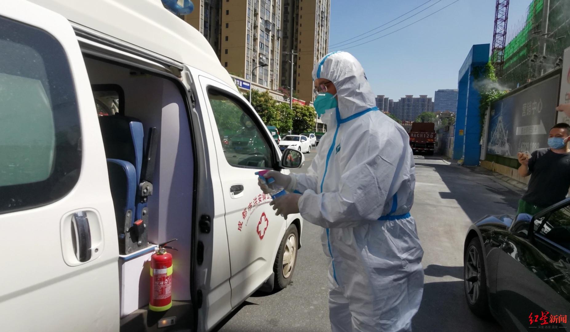 “吃住都在车上,在没有任务的时候可以在车上临时休息一下。”上午10点过,肖中伟刚从隔离酒店把人员转运完成,对车辆消完毒后马上又要去其他点位转运隔离人员。天气炎热,穿着防护服很不透气,他的手套里面全是汗水,“才戴了2分多种,已经全是汗水了。”肖中伟伸出手给记者看。在他负责的卫生院,由于人手有限,他临时帮忙开起了救护车,转运隔离人员。7月17日开始,他每天从早上七点过一直忙到晚上十一二点, 随时随地都会有新的任务通知。