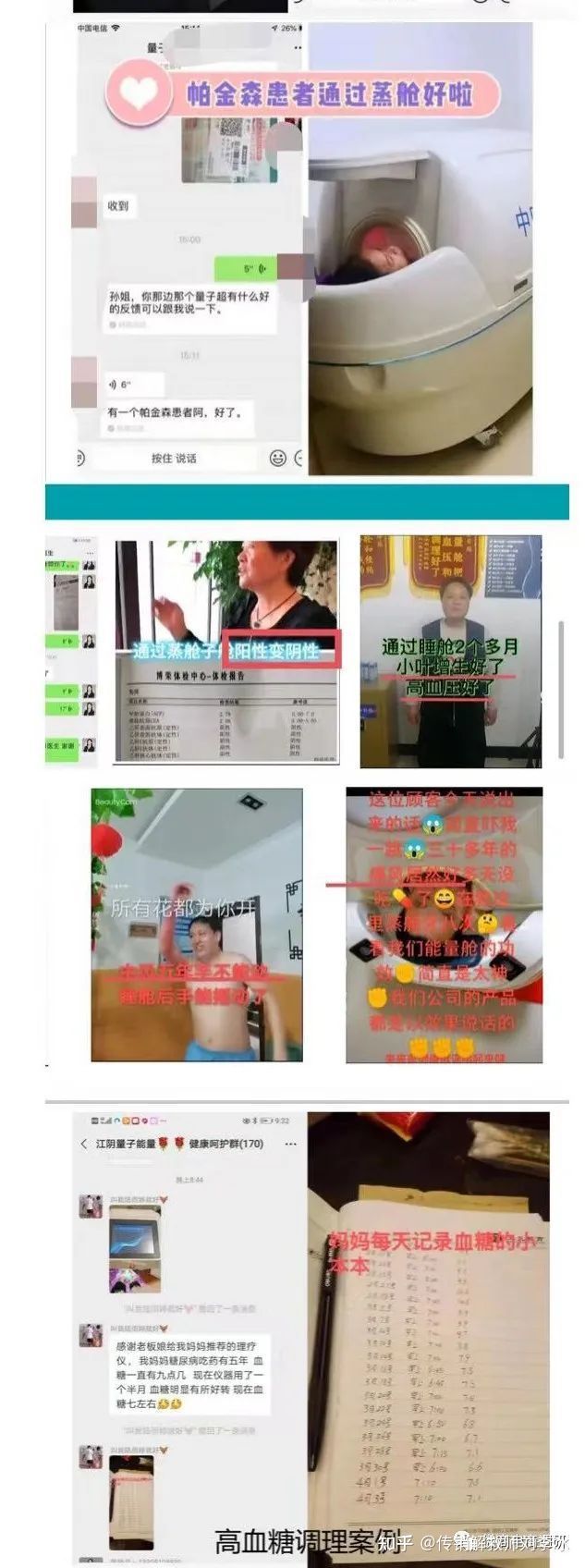 在代理商的宣传中,康每天线下的门店十分火爆,每天都有顾客排队蒸舱。代理还分享了许多案例,有的顾客通过蒸舱子宫肌瘤得到了改善;有的顾客蒸舱瘦了12斤;有的顾客蒸舱高血压降下来了,小叶增生也好了;有个三岁小宝宝蒸舱五分钟就治好了感冒发烧;还有个脑萎缩患者蒸舱半个月可以走路;甚至有个帕金森患者蒸舱调理后竟然康复了。