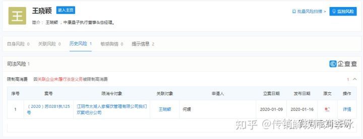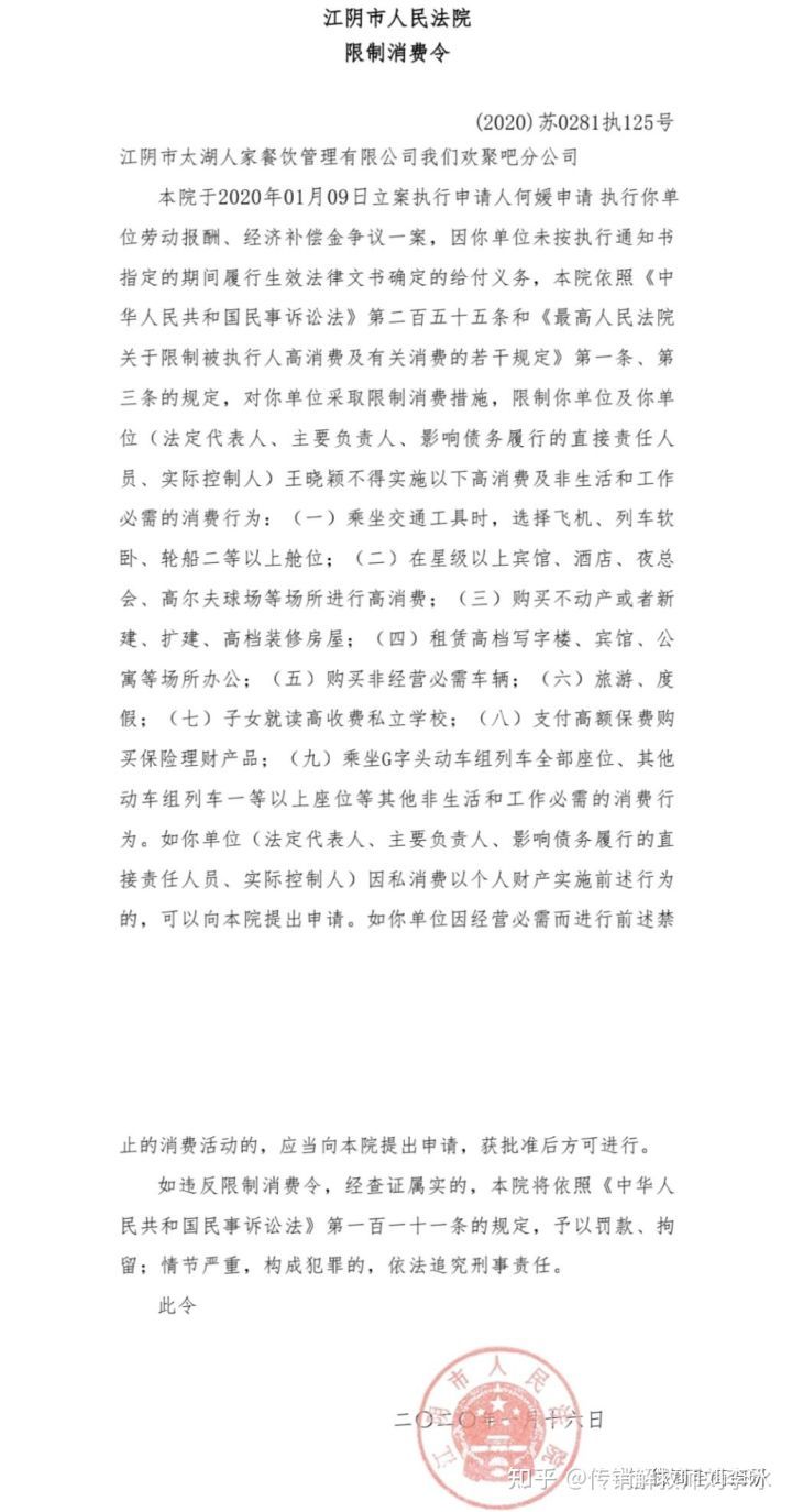 值得注意的是,由王浥尘担任负责人的江阴市太湖人家餐饮管理有限公司我们欢聚吧分公司曾因未给付执行通知书指定的劳动报酬和经济补偿金,被江阴市人民法院强制执行并限制高消费,其负责人王浥尘也被法院限制高消费。