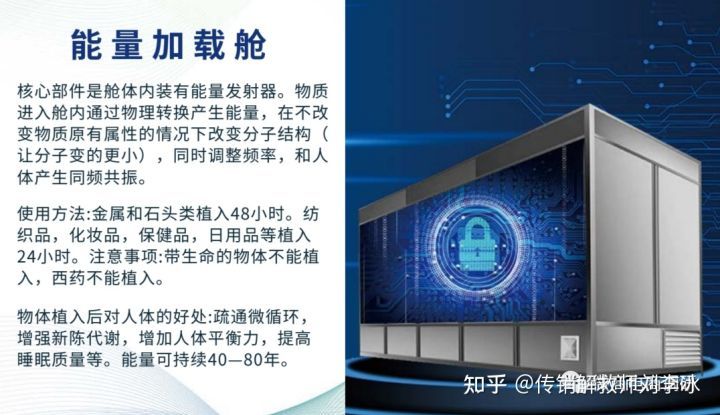 能量加载舱: 核心部件是舱体内装有能量发射器。物质进入舱内通过物理转换产生能量,在不改变物质原有属性的情况下改变分子结构(让分子变得更小),同时调整频率,和人体产生同频共振。使用方法:金属和石头类植入48小时。纺织品,化妆品,保健品,日用品等植入24小时。物体植入后对人体的好处:疏通微循环,增强新陈代谢,增加人体平衡力,提高睡眠质量等。能量可持续40—80年。