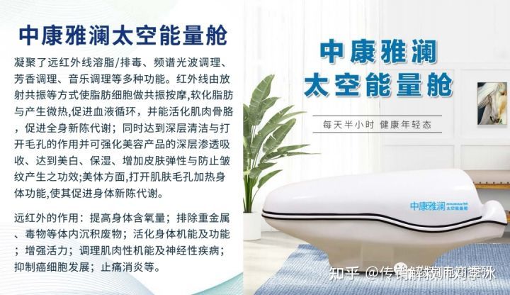 中康雅澜太空能量舱: 凝聚了远红外线溶脂/排毒、频谱光波调理、芳香调理、音乐调理等多种功能。红外线由放射共振等方式使脂肪细胞做共振按摩,软化脂肪与产生微热,促进血液循环,并能活化肌肉骨骼,促进全身新陈代谢;同时达到深层清洁与打开毛孔的作用并可强化美容产品的深层渗透吸收、达到美白、保湿、增加皮肤弹性与防止皱纹产生之功效;美体方面,打开肌肤毛孔加热身体功能,使其促进身体新陈代谢。远红外的作用:提高身体含氧量;排除重金属、毒物等体内沉积废物;活化身体机能及功能;增强活力;调理肌肉性机能及神经性疾病;抑制癌细胞发展;止痛消炎等。