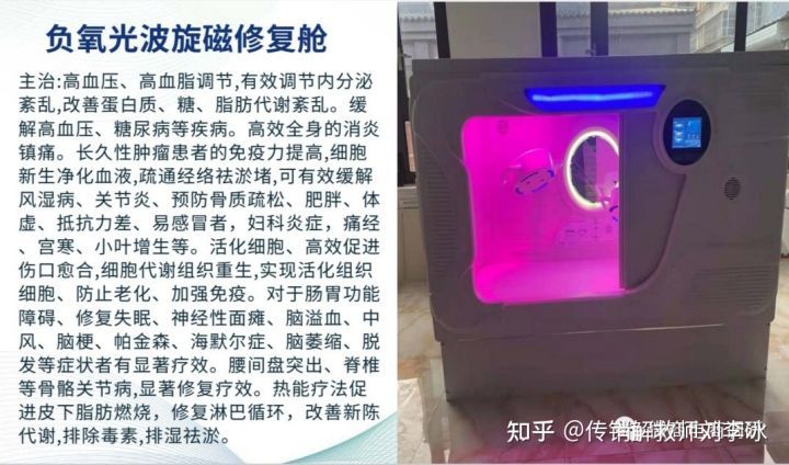 负氧光波旋磁修复舱: 主治高血压、高血脂调节,有效调节内分泌紊乱,改善蛋白质、糖、脂肪代谢紊乱。缓解高血压、糖尿病等疾病。高效全身的消炎镇痛。长久性肿瘤患者的免疫力提高,细胞新生净化血液,疏通经络祛淤堵,可有效缓解风湿病、关节炎、预防骨质疏松、肥胖、体虚、抵抗力差、易感冒者,妇科炎症,痛经、宫寒、小叶增生等。活化细胞、高效促进伤口愈合,细胞代谢组织重生,实现活化组织细胞、防止老化、加强免疫。对于肠胃功能障碍、修复失眠、神经性面瘫、脑溢血、中风、脑梗、帕金森、海默尔症、脑萎缩、脱发等症状者有显著疗效。腰间盘突出、脊椎等骨骼关节病,显著修复疗效。热能疗法促进皮下脂肪燃烧,修复淋巴循环,改善新陈代谢,排除毒素,排湿祛淤。