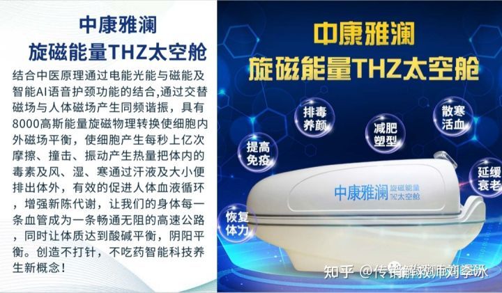 中康雅澜旋磁能量THZ太空舱:结合中医原理通过电能光能与磁能及智能AI语音护颈功能的结合,通过交替磁场与人体磁场产生同频谐振,具有8000高斯能量旋磁物理转换使细胞内外磁场平衡,使细胞产生每秒上亿次摩擦、撞击、振动产生热量把体内的毒素及风、湿、寒通过汗液及大小便排出体外,有效地促进人体血液循环,增强新陈代谢,让我们的身体每一条血管成为一条畅通无阻的高速公路,同时让体质达到酸碱平衡,阴阳平衡。创造不打针,不吃药智能科技养生新概念。有排毒养颜、恢复体力、提高免疫、减肥塑形、散寒活血、延缓衰老的功效。