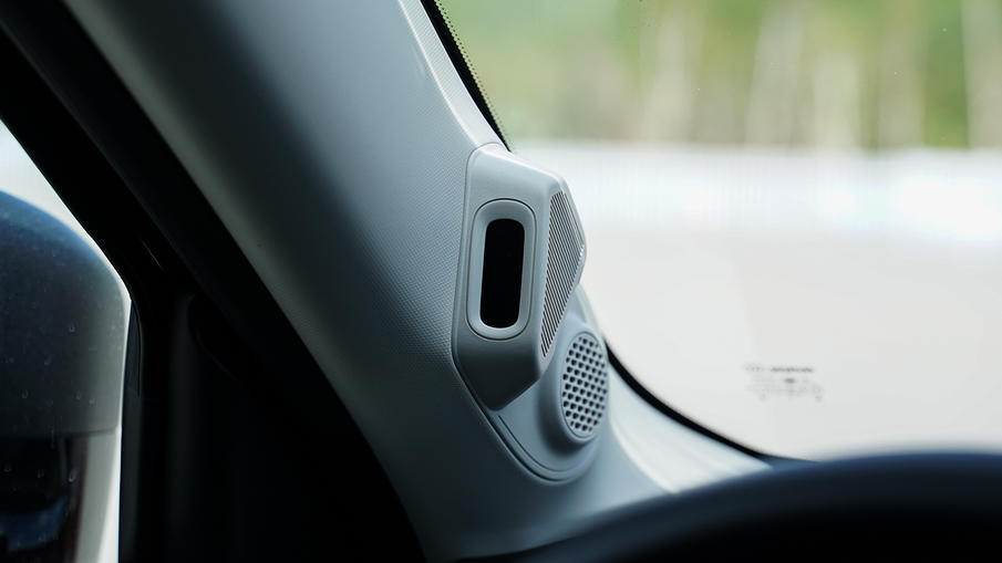 A柱增加了人脸识别的摄像头,可通过人脸识别登录个人中心,保护个人隐私,同时也可以进行上车问候、疲劳监测、分心提醒,吸烟模式,也能根据喜怒哀乐的表情推送音乐,让车辆更加聪明机智。