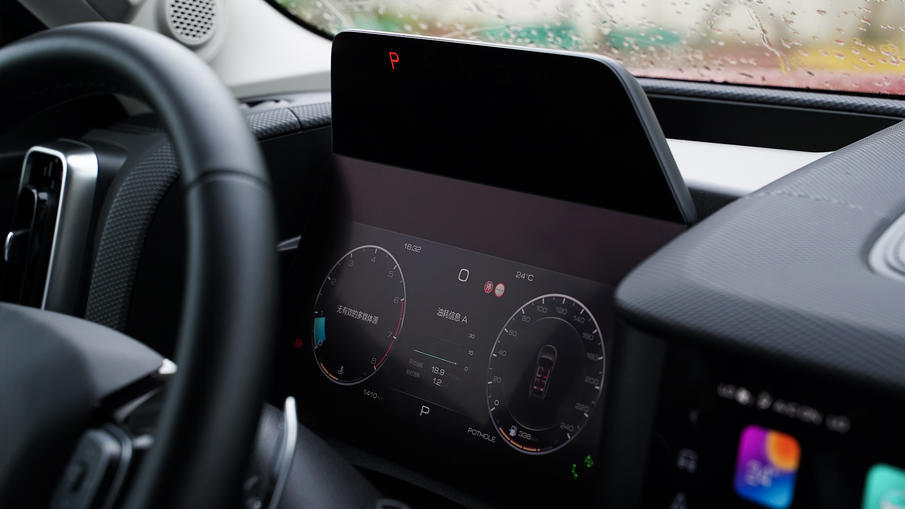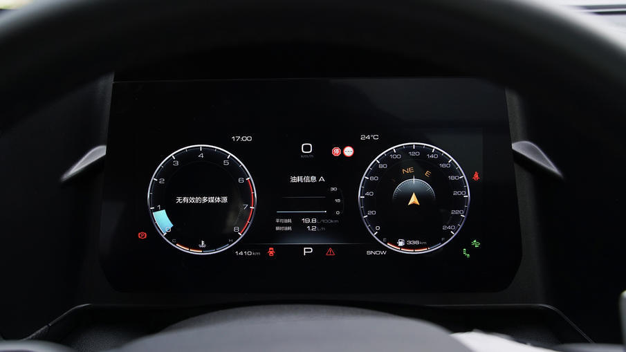 仪表盘分为上下两个部分,上部分只显示挡位信息,更加独立直观,不过有个十分贴心的细节就是上半部分采用外凸设计,能够为下部分遮挡一部分阳光。下方液晶仪表的界面进行全新的设计,采用双圈仪表主题,能满足多媒体、ADAS、行车电脑、导航的多个功能的显示。