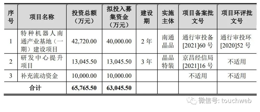 晶品特装计划募资6.3亿元,其中,4亿元用于特种机器人南通产业基地(一期)建设项目,1.3亿元用于研发中心提升项目,1亿元用于补充流动资金。