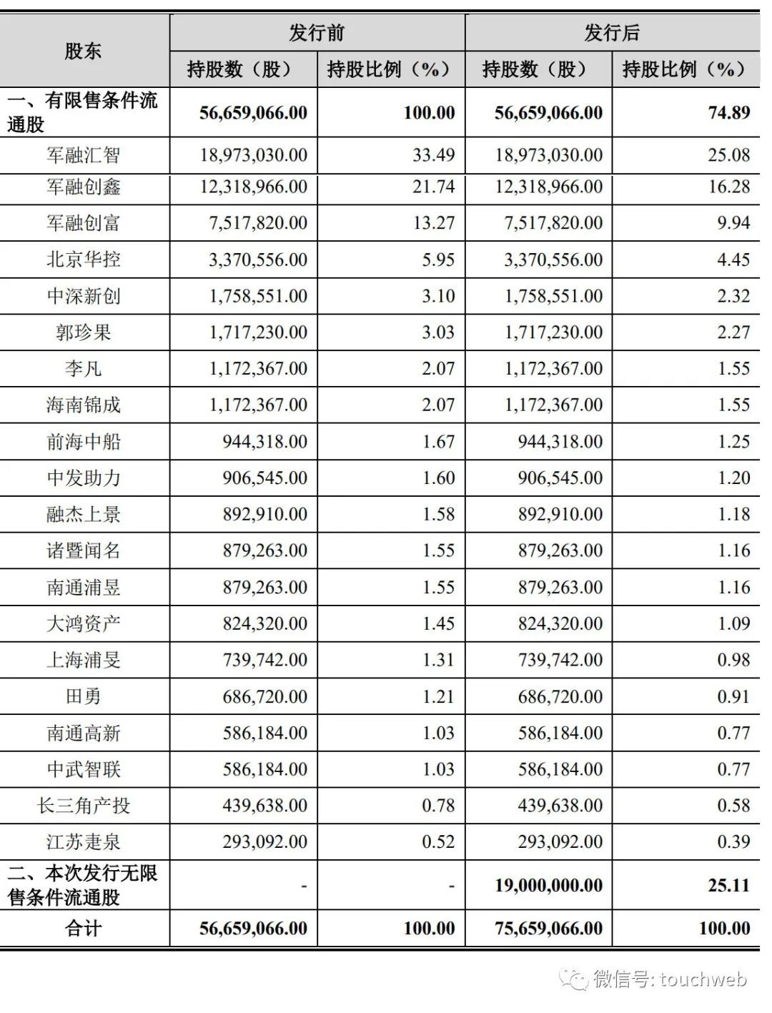 IPO后,军融汇智持股为25.08%,军融创鑫持股为16.28%,军融创富持股为9.94%,北京华控持股为4.45%,中深新创持股为2.32%,郭珍果持股为2.27%,李凡、海南锦成分别持股为1.55%,前海中船持股为1.25%。