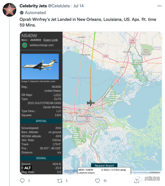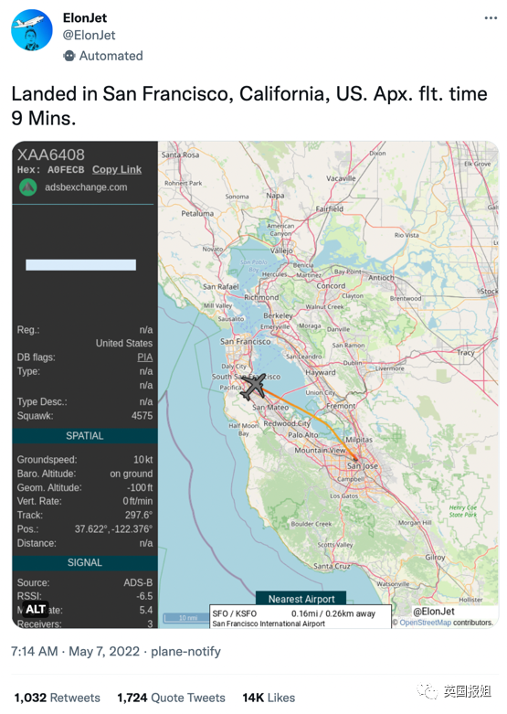 这些从十几分钟到几小时的名人私人飞机的记录之外,另外还有一个名叫@elonjet的账号,专门记录埃隆·马斯克私人飞机的飞行情况。