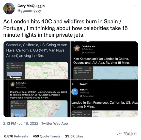 “伦敦热到40摄氏度,西班牙葡萄牙野火烧不尽,我想到这些坐着航程15分钟私人飞机的名人们。”