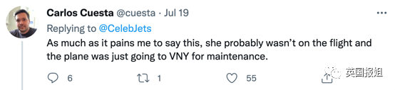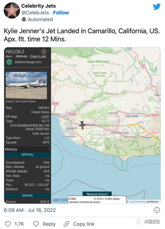 7月16日,该账号又上传凯莉私人飞机在加州Camarillo机场至加州Van Nuys的同一航程,这次仅飞了12分钟。