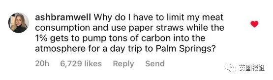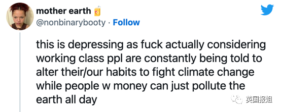 “这也太特么让人沮丧了,想想工人阶级总是被教导选择坐飞机时要考虑对环境的影响,而有钱人每天都在污染地球。”