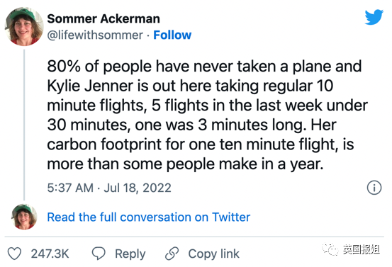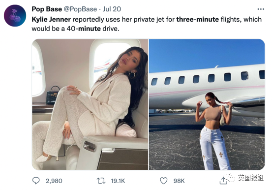 “80%的人没坐过飞机,而凯莉·詹娜习惯性地坐着10分钟航程的飞机,上周有5次30分钟以下的飞行,还有一次只有3分钟长的。她10分钟航程的碳足迹,比一些人一年的量都多。”