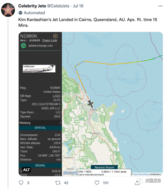 与此同时,@celebjets除了曝光凯莉的10分钟航程情况,也曝光了其他拥有私人飞机名人的飞行行为。