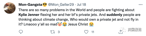 “世界上有那么多问题,然后大家为了凯莉炫耀自己和男友的飞机的事情吵架?大家都开始关心起气候变化了?谁买了私人飞机不飞啊?笑死我了你们好疯,吉瑟斯!”