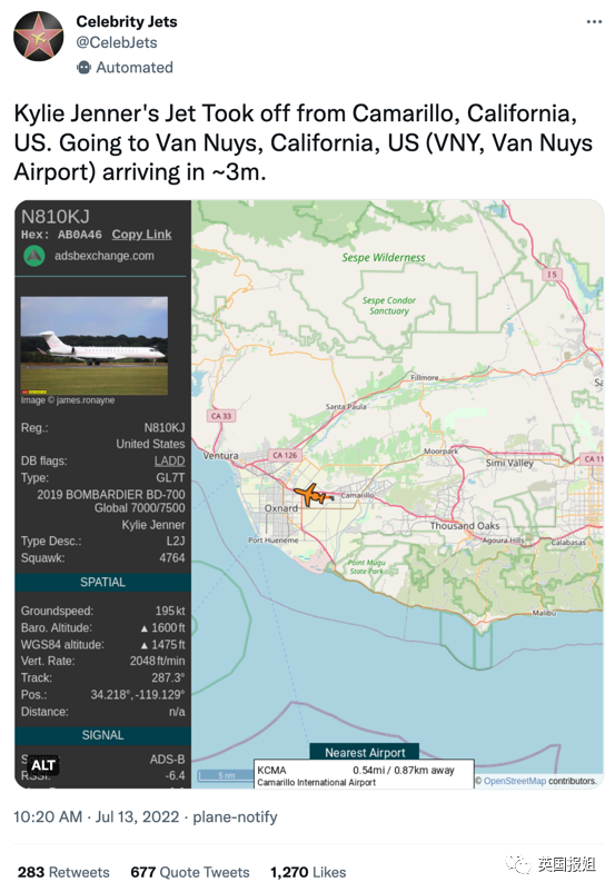 上周,卡戴珊-詹娜家族的Kylie Jenner凯莉·詹娜,被一个专门记录名人私人飞机飞行状况的账号@celebjets扒出,她的飞机一周之内至少飞了两次不到15分钟的航程。