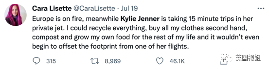 “欧洲着火,与此同时凯莉·詹娜用她的私人飞机飞了15分钟的航程。我可以循环利用所有的东西,买二手衣服,一辈子都用厨余垃圾施肥种菜,但这都不足以抵消她一趟飞行的碳足迹。”