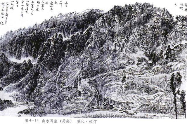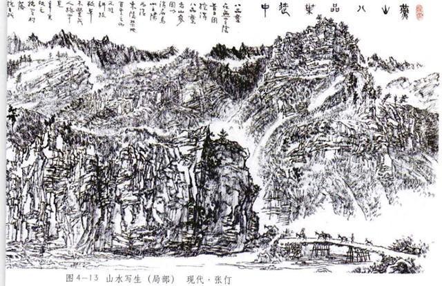 以浓干墨为主,水分较少,运笔多见飞白枯笔。画时应注意主次,虚实,一般多中锋用笔,侧锋皴擦,前后层次要分明。(图4-13、图4-1)