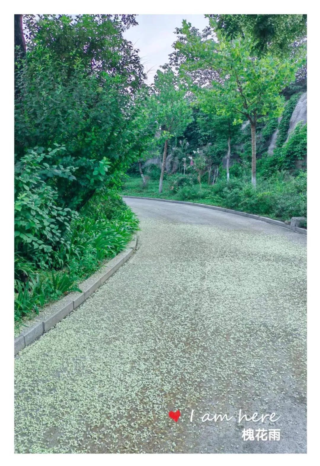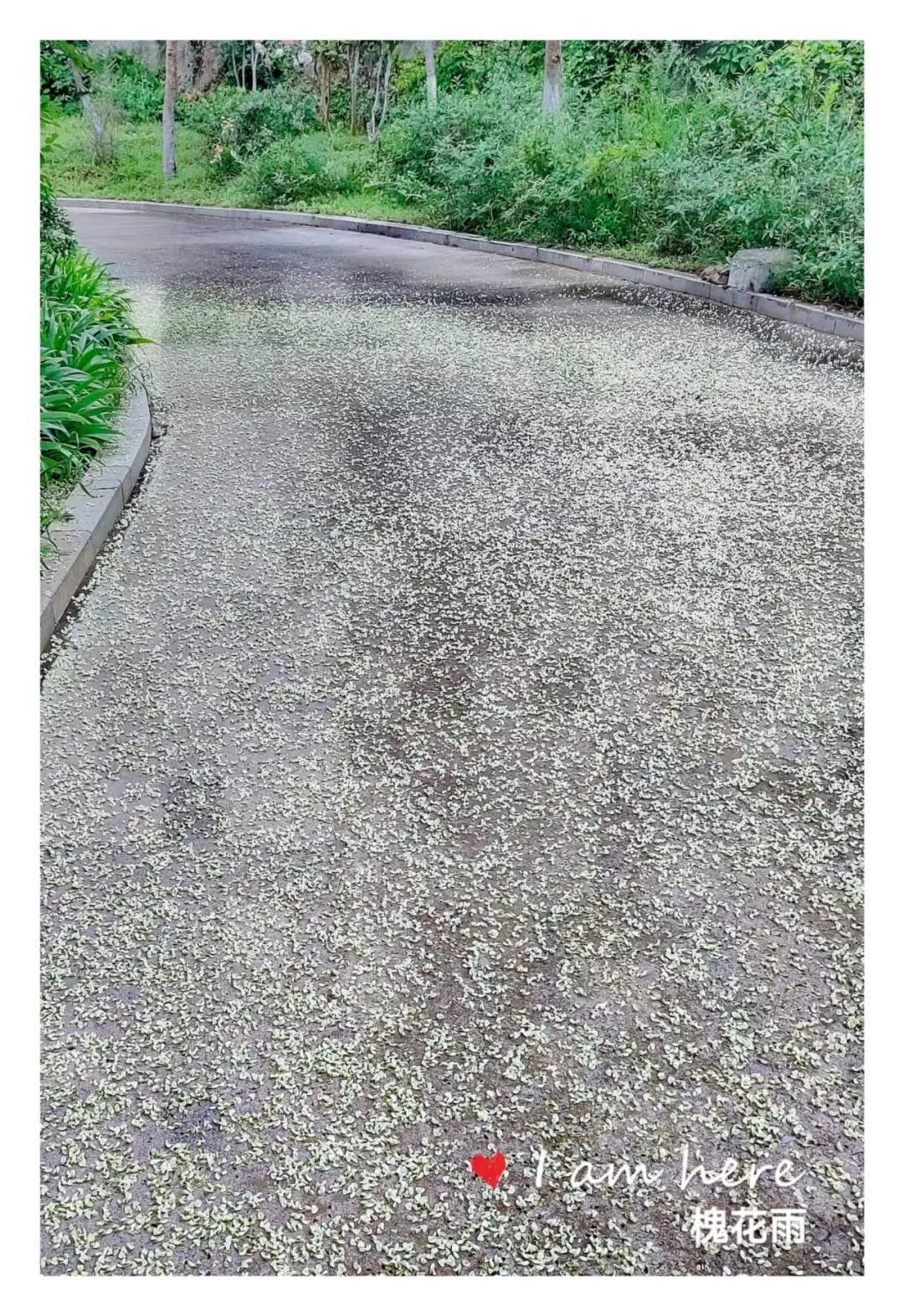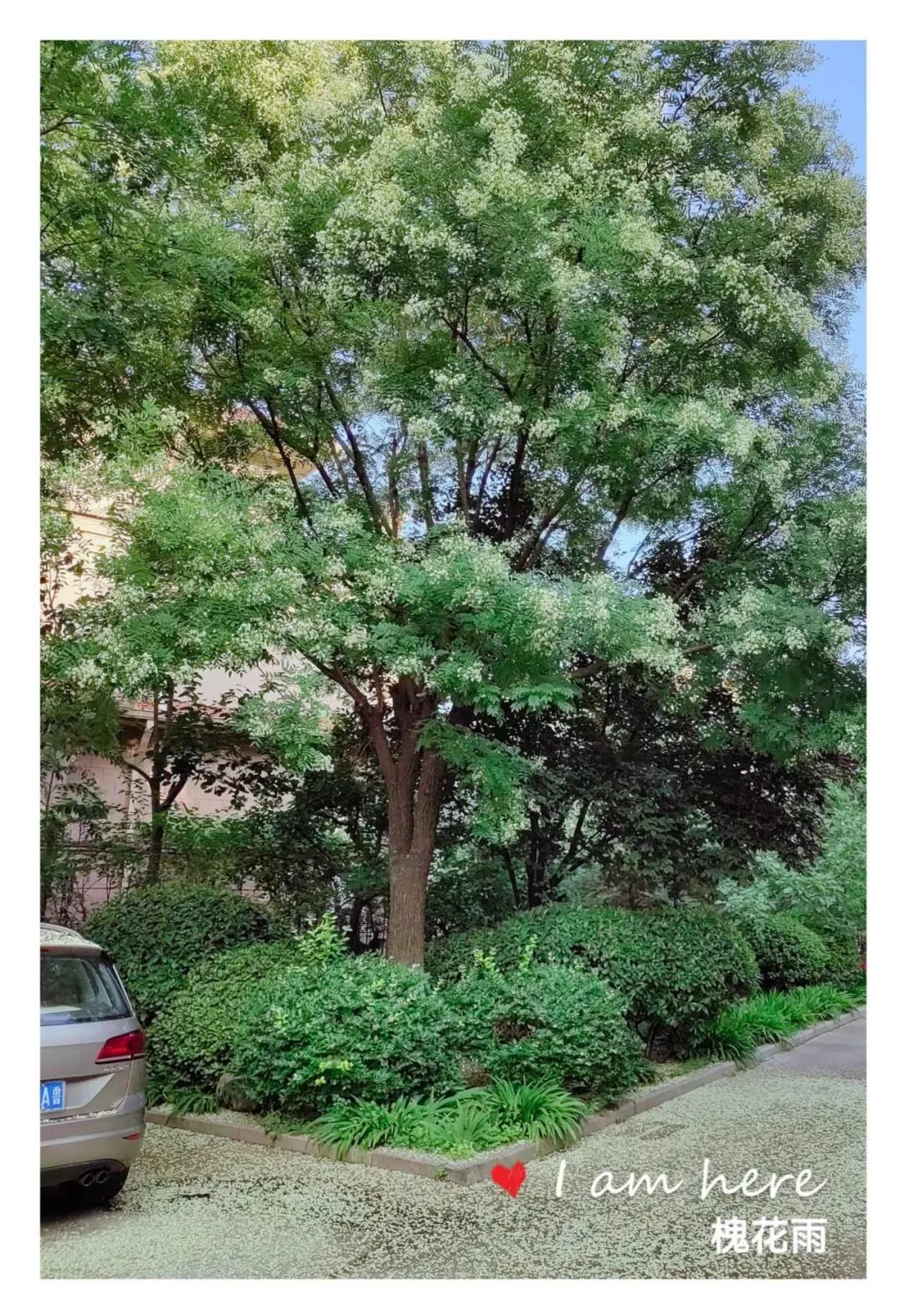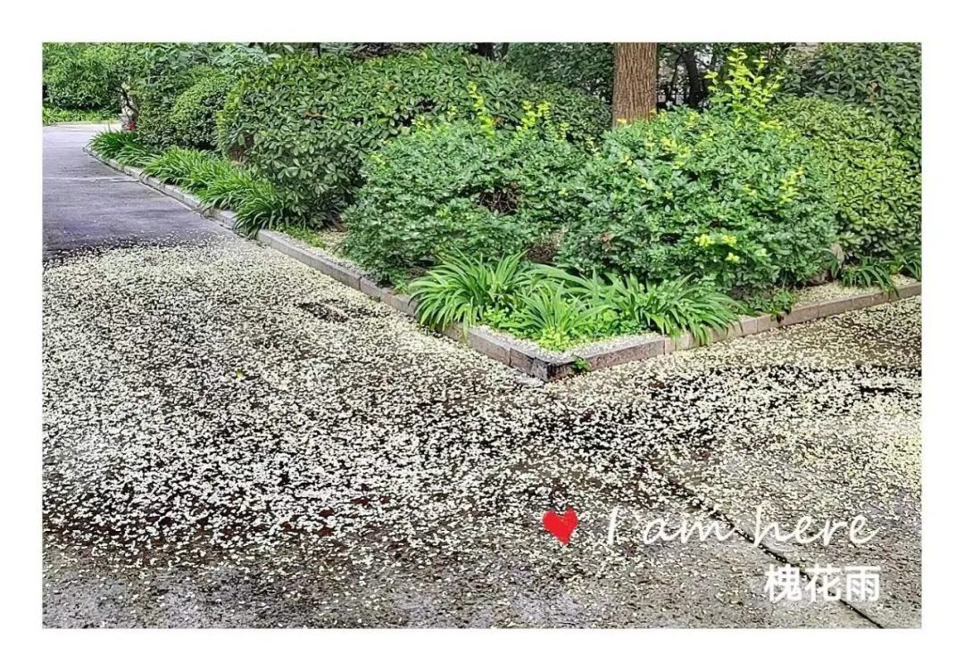 又过几日,槐花雨就真真地下起来了!微风吹过,大批的槐花如同精灵般簌簌落下,唰唰作响,那形态那声响极像是雨滴落下。落在地上,落在行人的身上,落在停放在树下的车上,落在浓密的绿植上,落在池塘的水面上。一片乳白,微微泛黄,整个小区变成了一卷散着槐花香味的水墨画。徜徉在卷中,心是醉的。醉于满目的清爽,醉于怡人的清香。