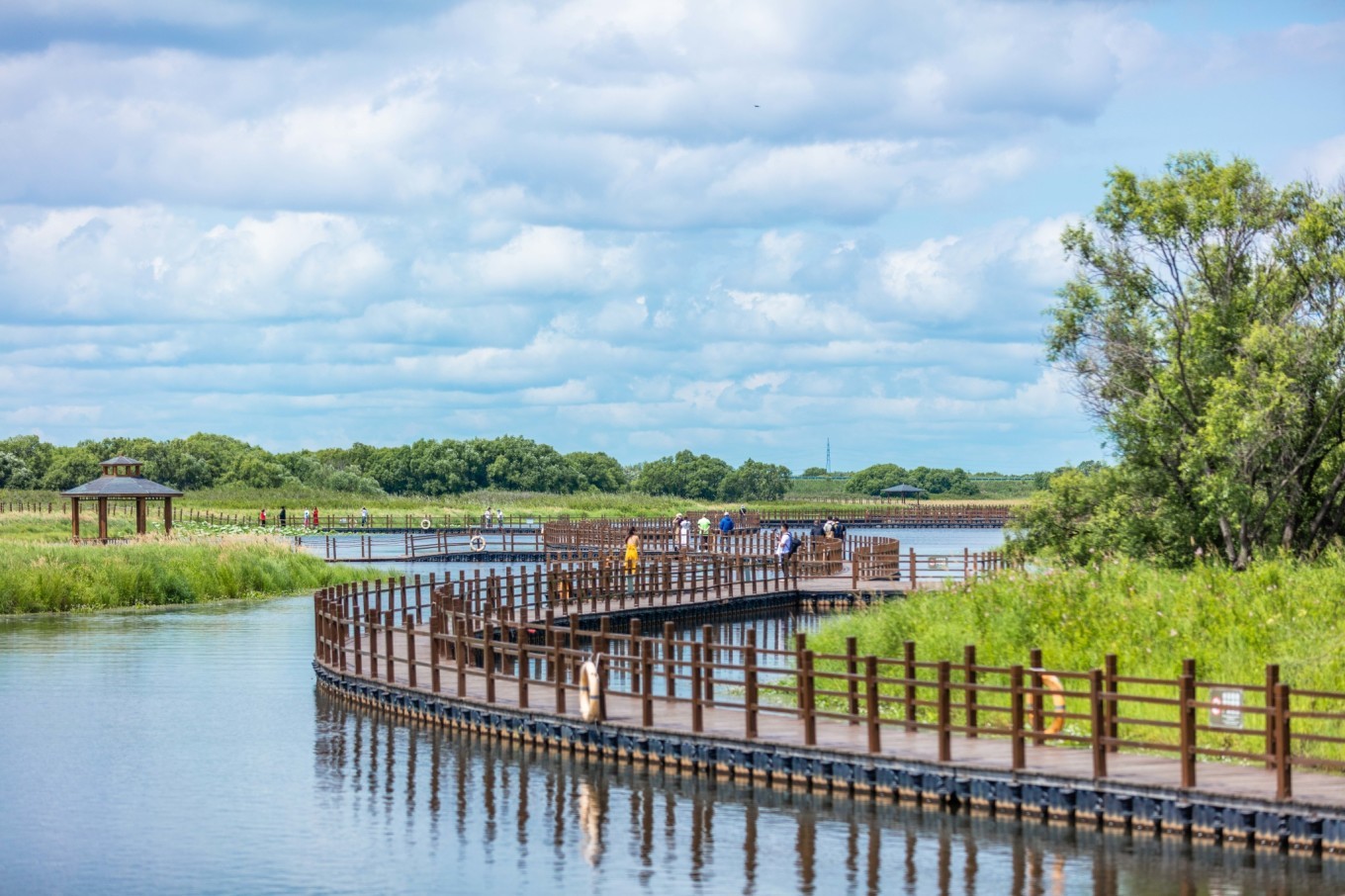 一条环岛栈道,让人们可以近距离的走进它,感受它的美。这里良好的植被和水文条件,为各种野生动物提供了优越的栖息和繁衍场所,造就了丰富的湿地动物多样性。