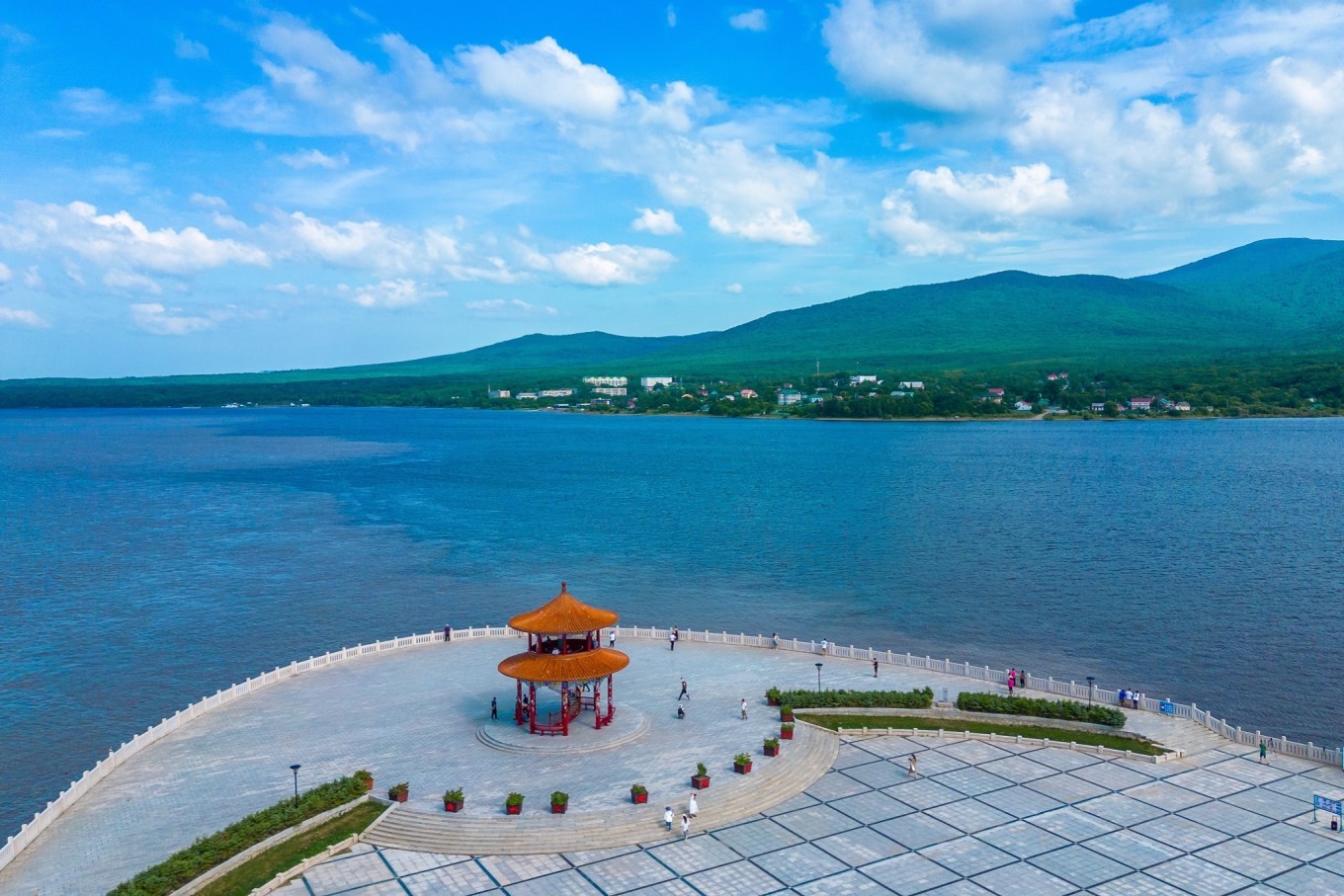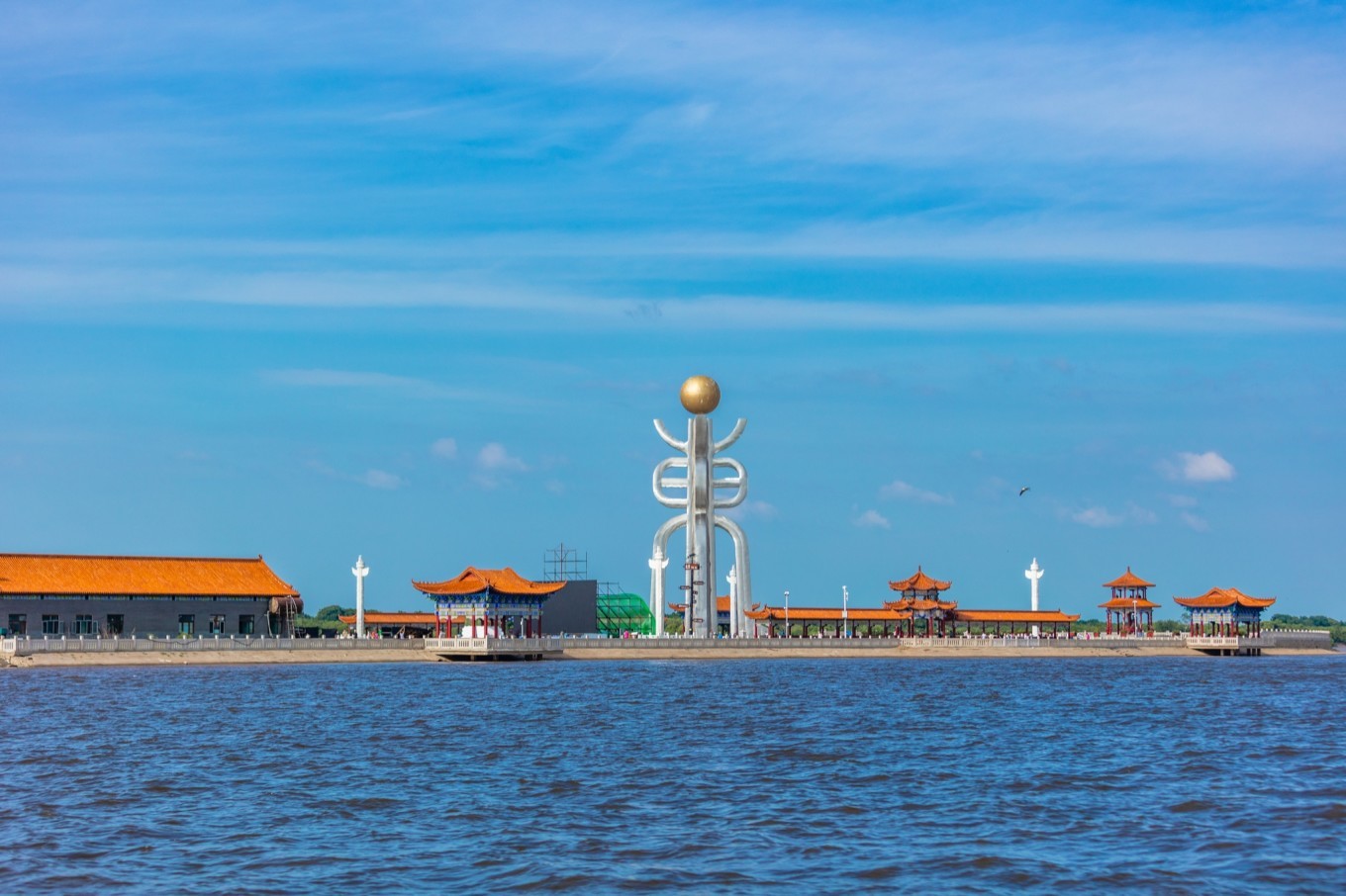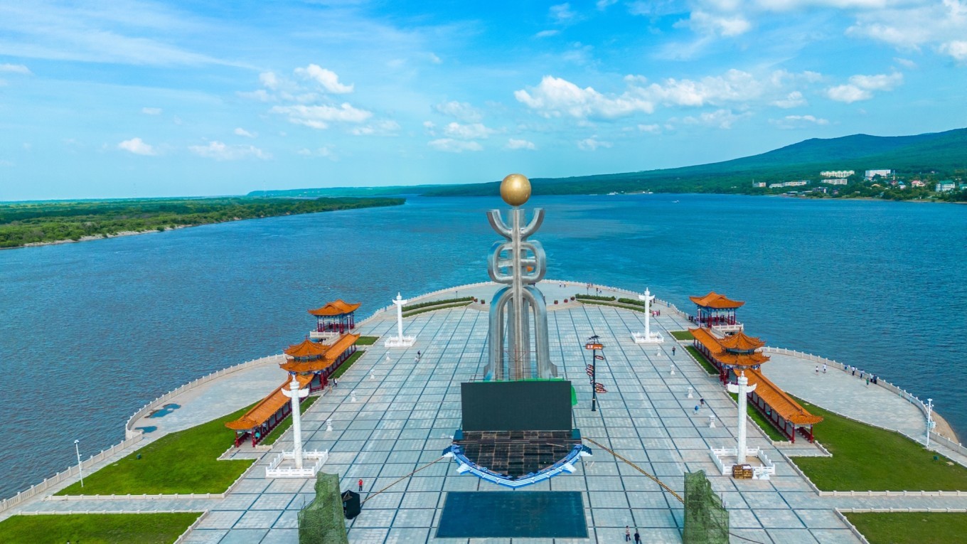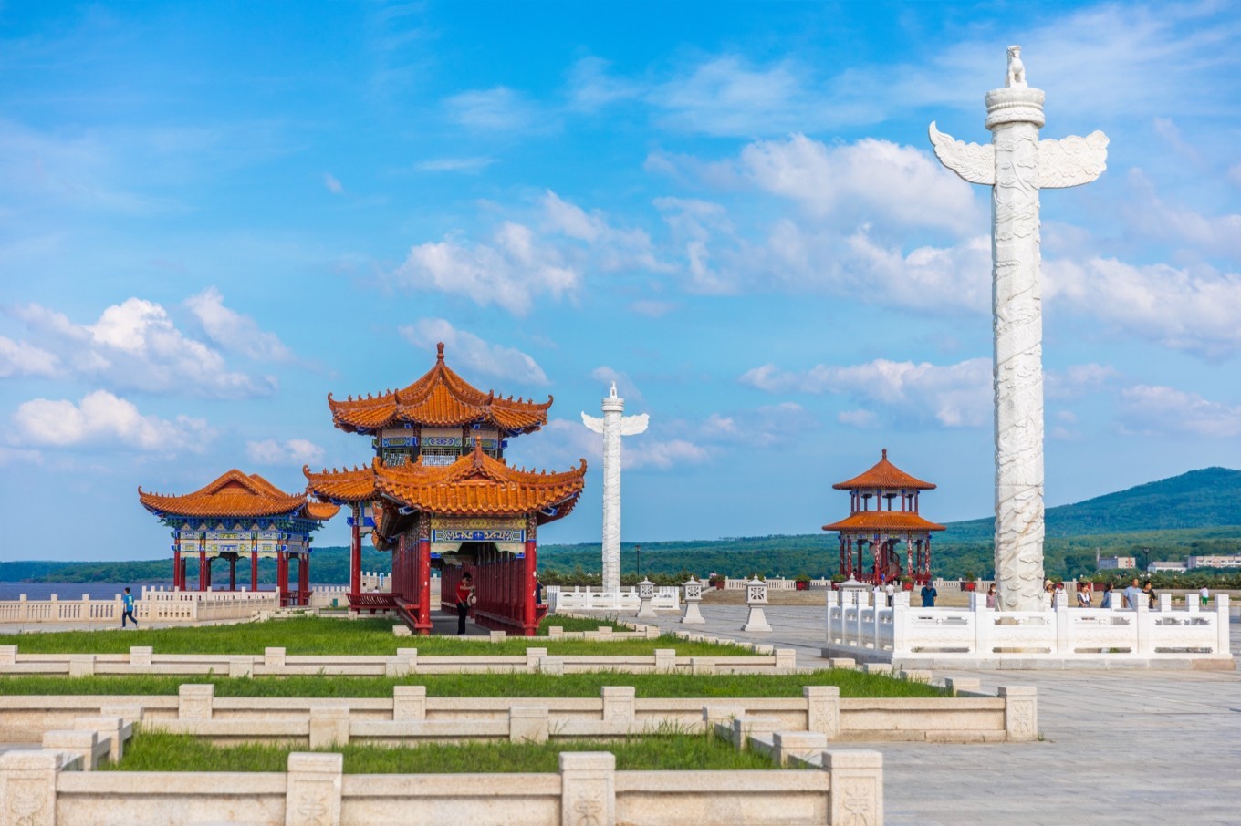 广场占地面积很大,有太阳亭、游廊、华表、水榭、游船码头、汉 白玉 围栏等,都是典型的东方建筑。站在这里视野开阔,可以看到对岸 俄罗斯 的卡扎克维茨沃镇。