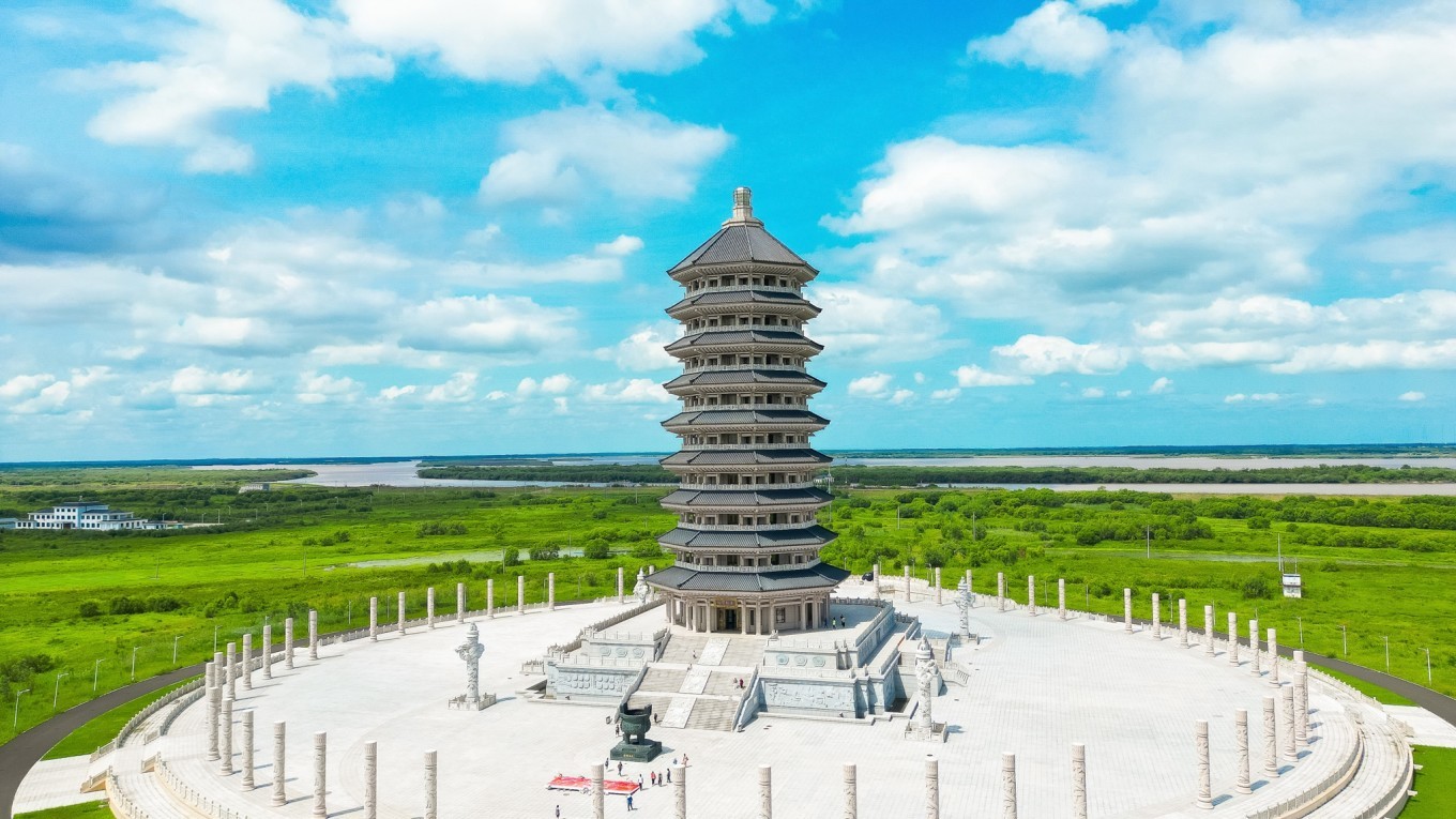 东极宝塔位于黑瞎子岛的东部极角,是一座仿汉唐风格的九层宝塔,象征九九归一。广场上耸立着56根青石盘龙浮雕柱,代表56个民族同心协力,共同守卫祖国的神圣领土。