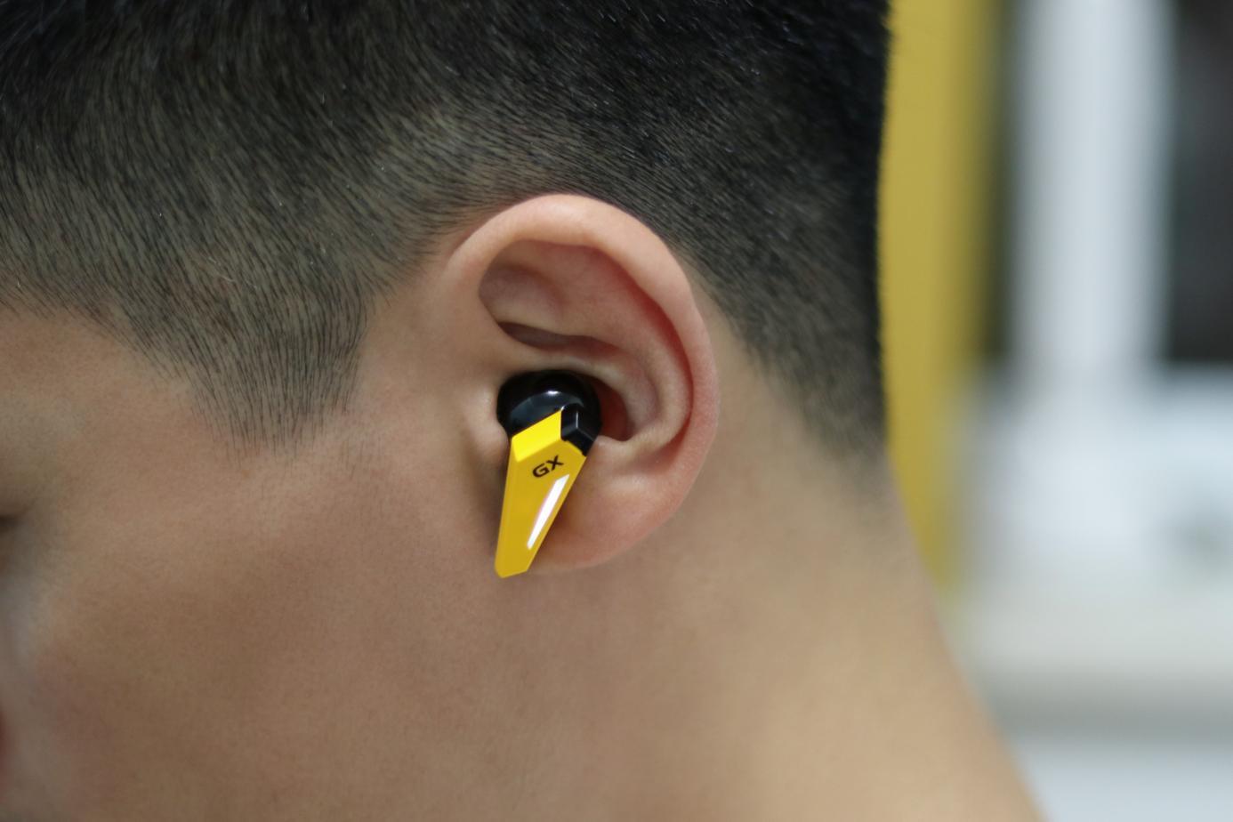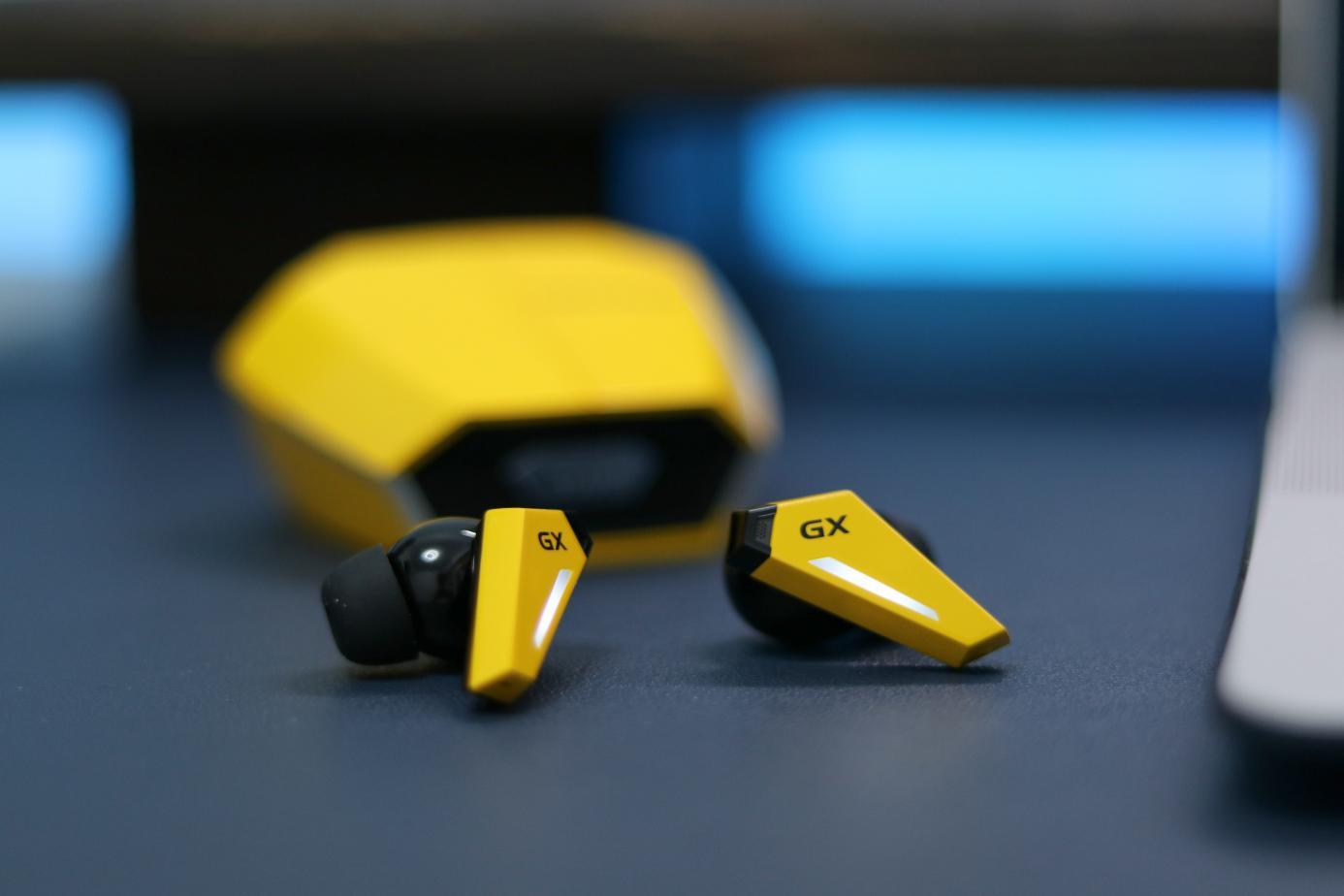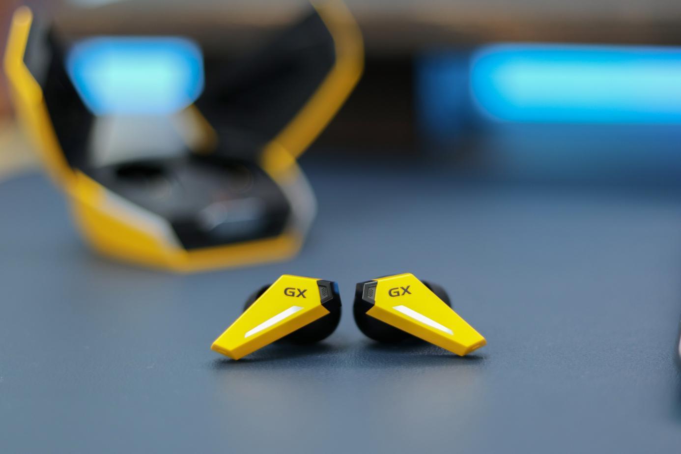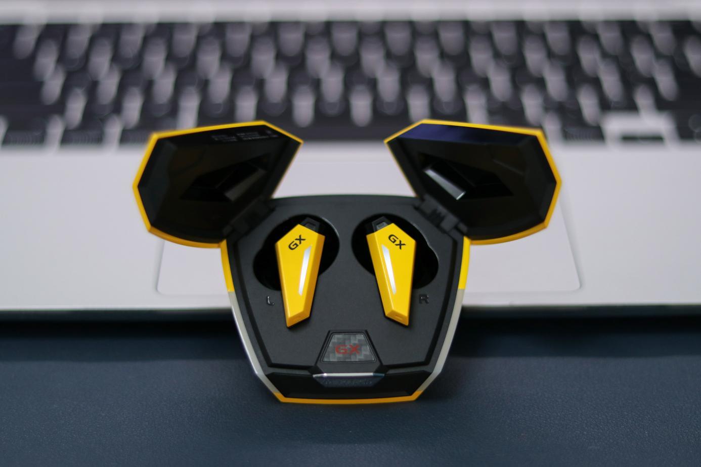 再看看耳机本体,与充电仓采用了同样风格的设计,耳柄部分线条棱角分明,黑黄色的巧妙搭配,让耳机看上去就战斗气息满满,耳柄上印有GX字样,并同样设计有RGB灯条,戴着耳朵上给人的感觉就一个字,酷!