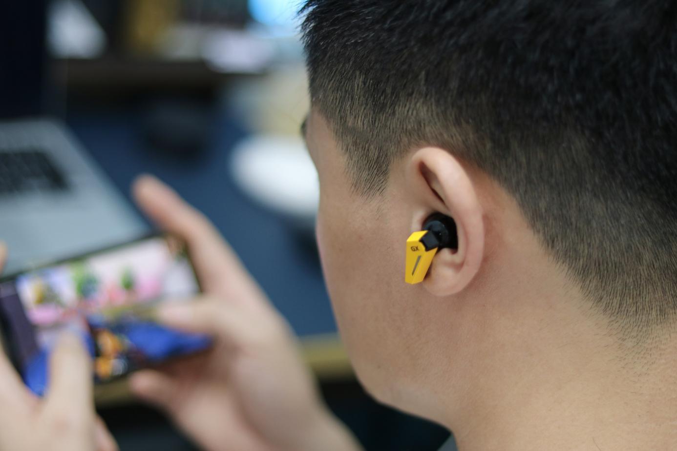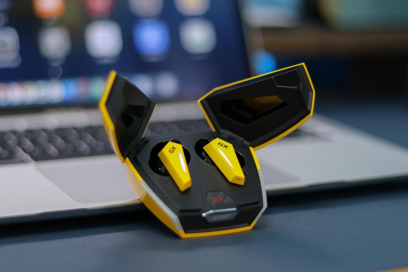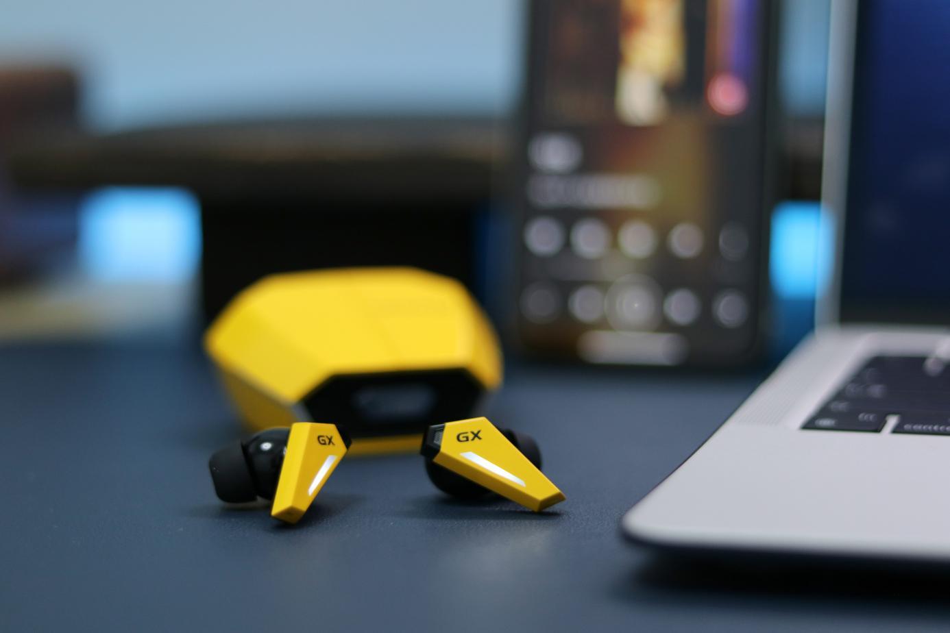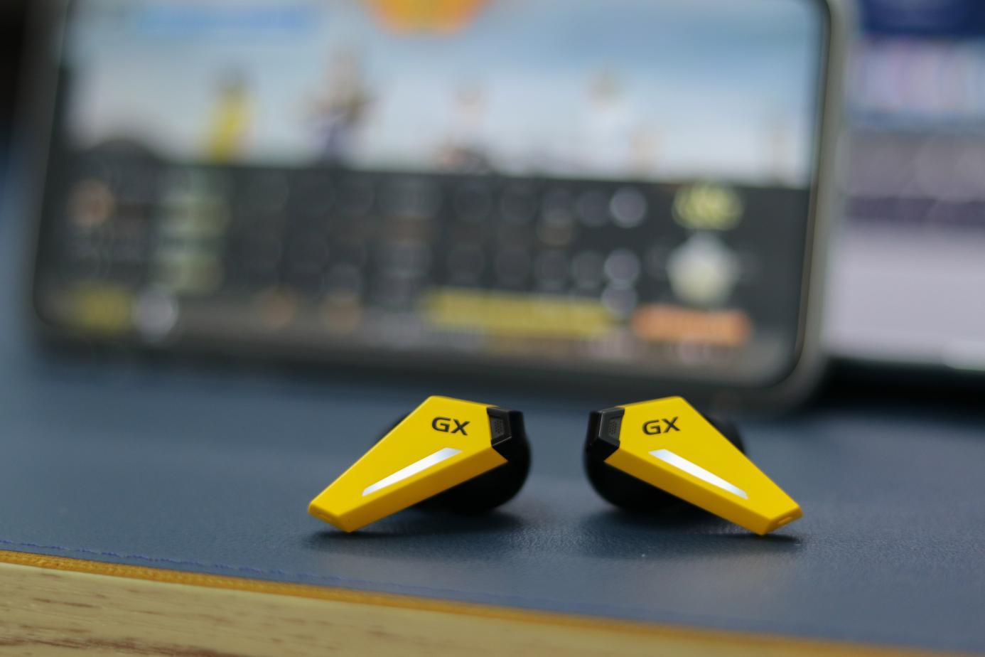 再看看耳机本体,与充电仓采用了同样风格的设计,耳柄部分线条棱角分明,黑黄色的巧妙搭配,让耳机看上去就战斗气息满满,耳柄上印有GX字样,并同样设计有RGB灯条,戴着耳朵上给人的感觉就一个字,酷!