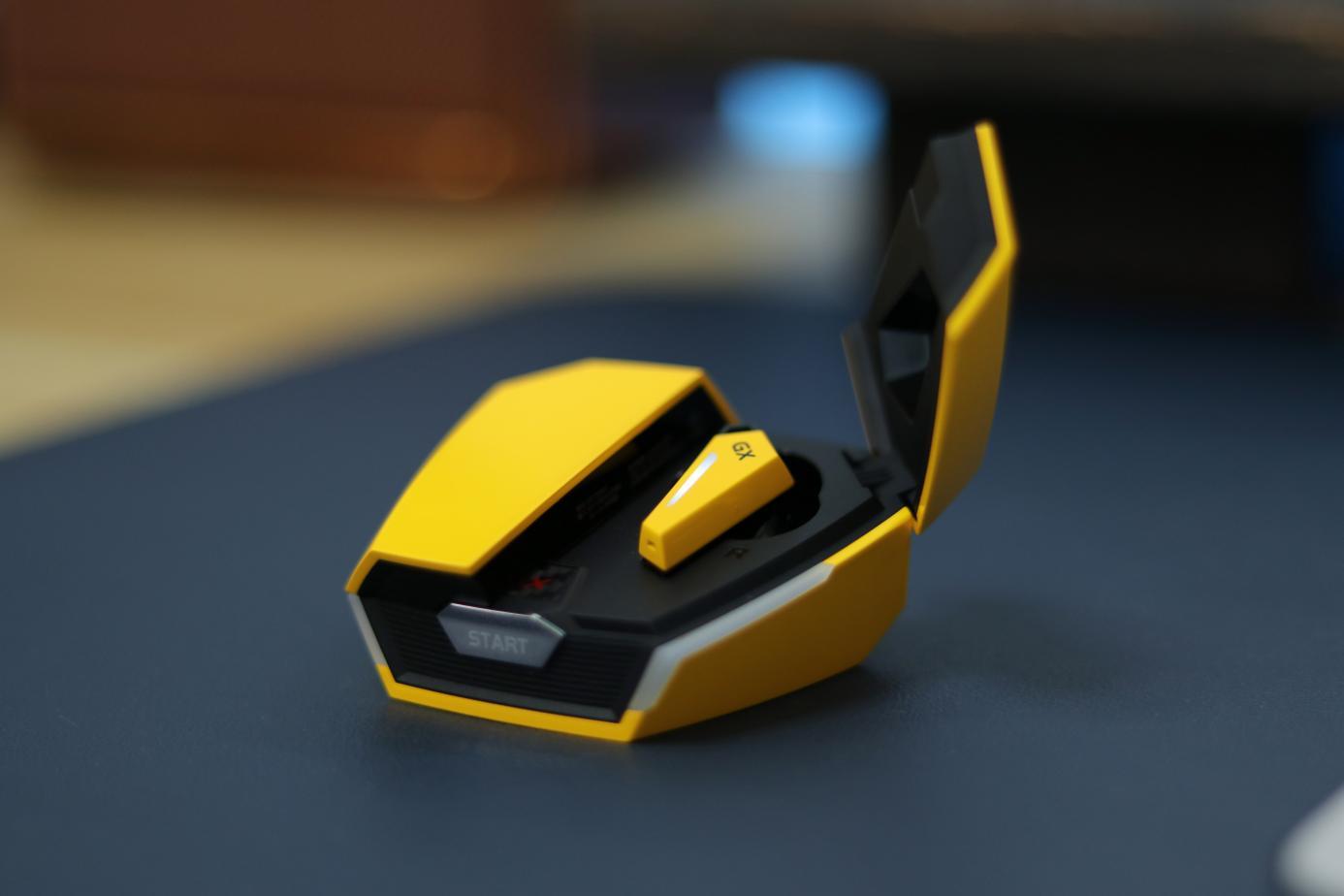 最让我拍案叫绝的设计,是它的飞翼门造型仓盖设计,不同于市面上大多数无线耳机,漫步者GX07的充电仓盖被设计成了两部分,分别向左右45度开启,同时开启时,整个充电仓的造型就像跑车的飞翼式车门,非常的具有创意,加上我选的黄色配色,有时候看上去这副耳机有一点变形金刚大黄蜂的感觉。