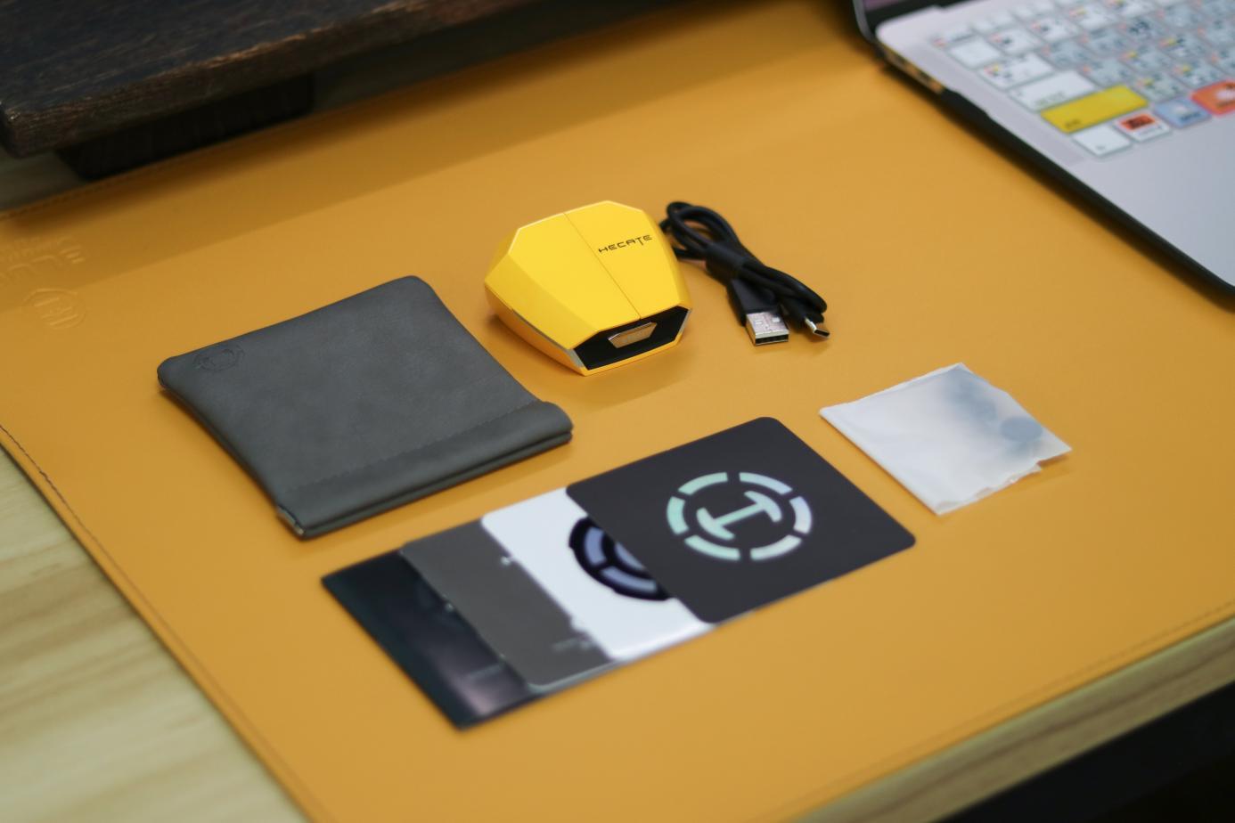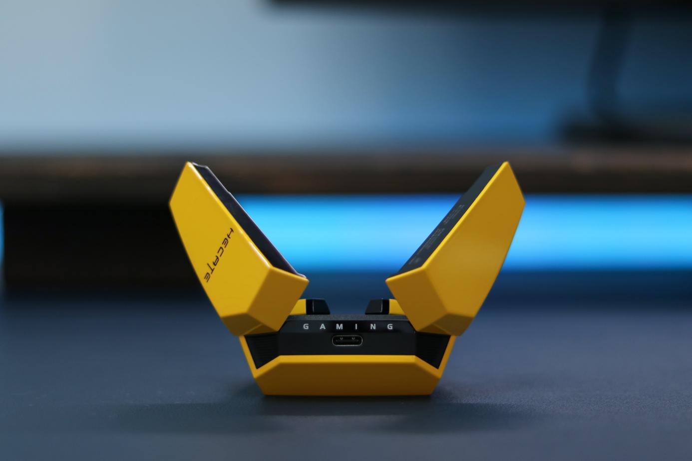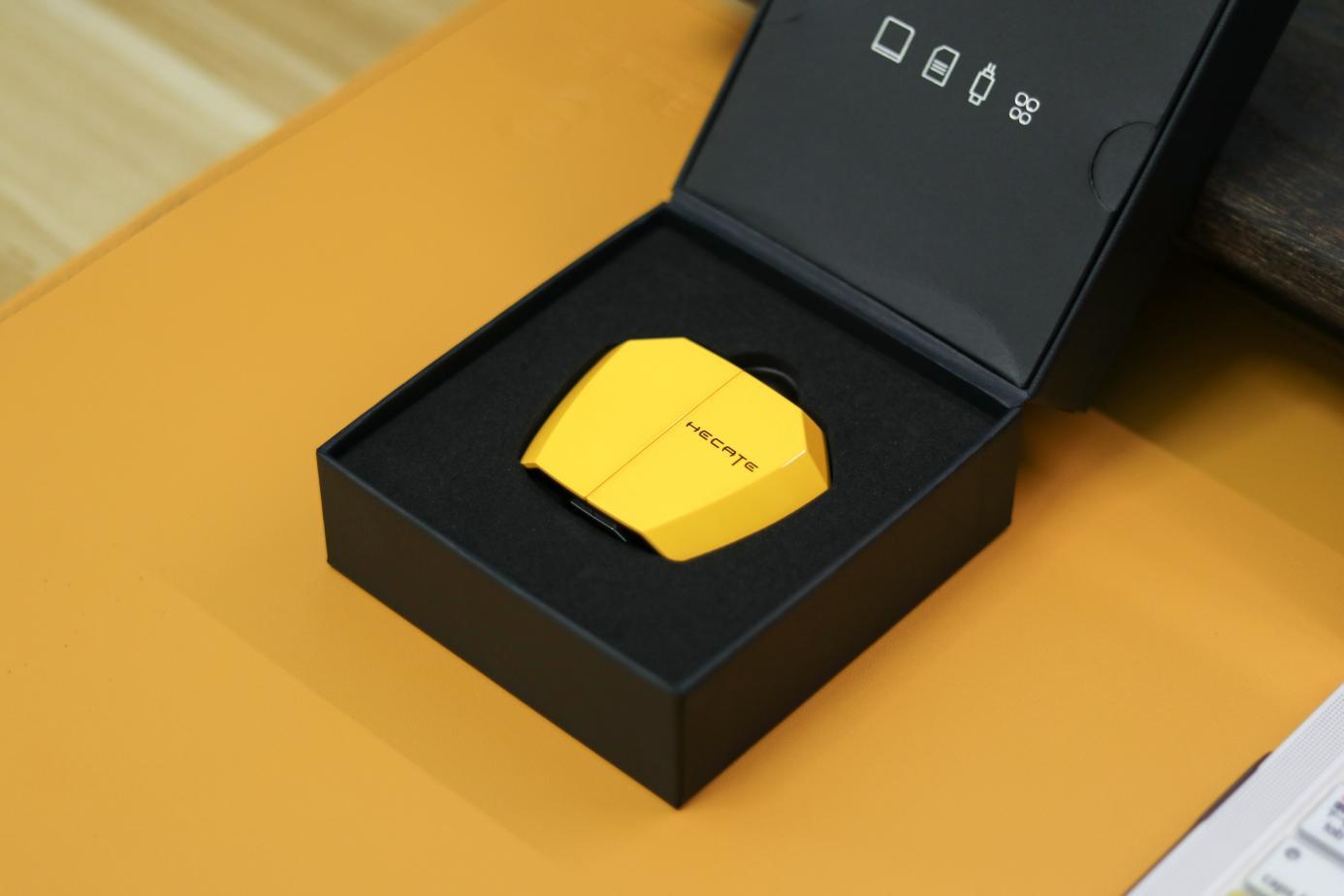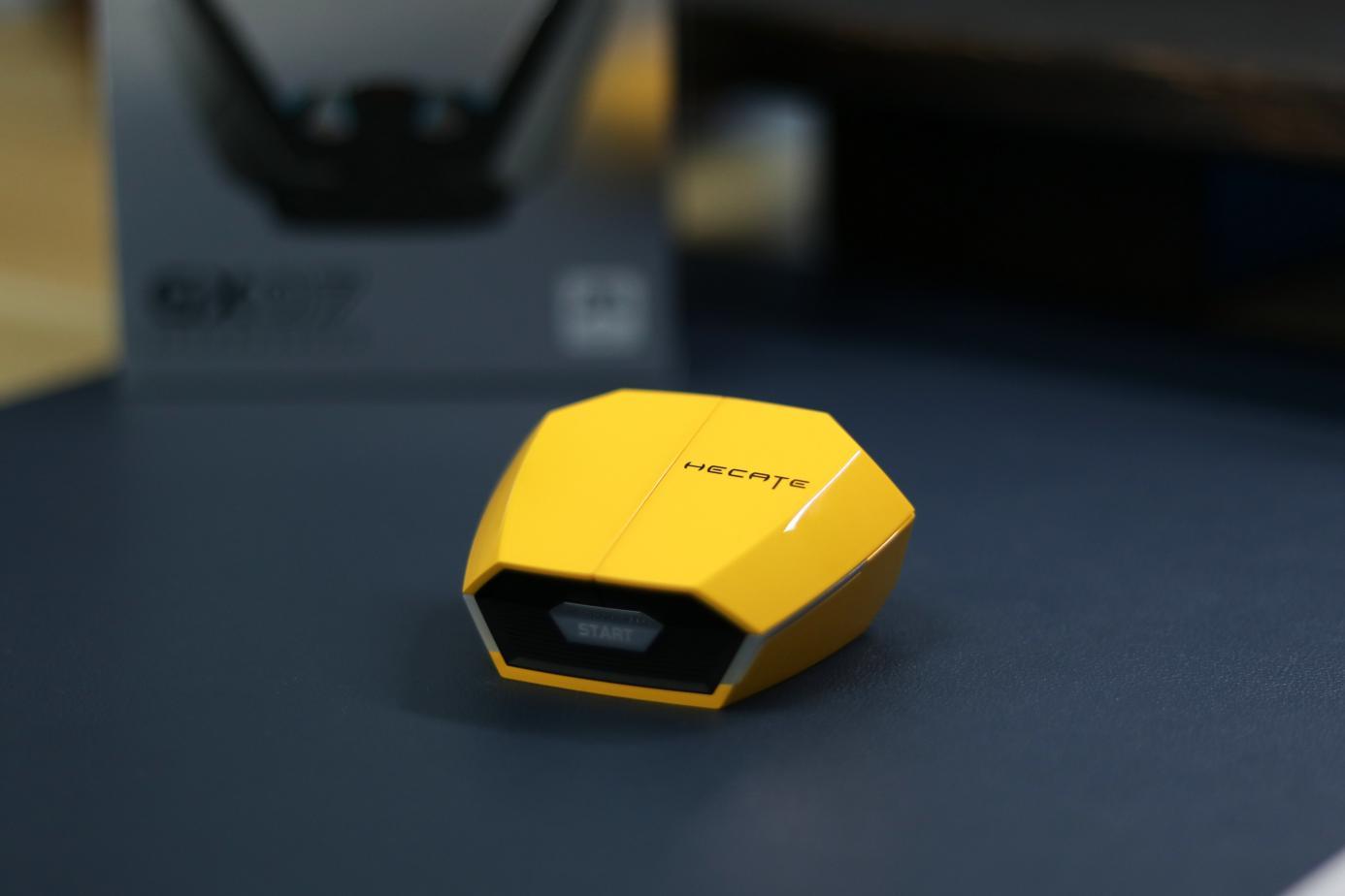 配色方面,我选择的是兰博黄,不同于市面上千篇一律的无线耳机造型,漫步者GX07的外观设计可以用大胆,激进来形容,整个充电仓呈跑车线条的造型,视觉上非常具有战斗气息,顶盖上印有HECATE标识,宣示了它的电竞属性。