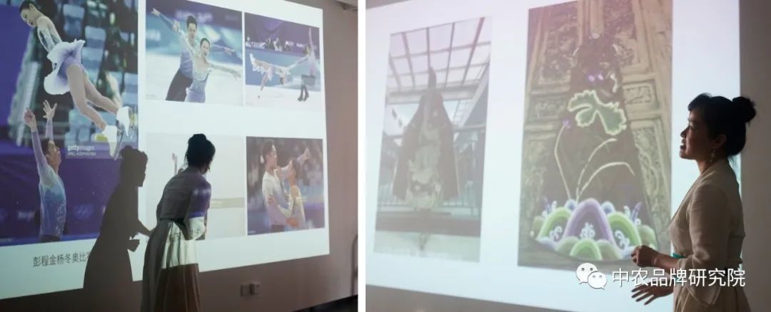 孙教授以2022北京冬奥会花样滑冰比赛服设计为例,详细介绍了中国组合彭程/金杨短节目《月光》、男子单滑金博洋《卧虎藏龙》比赛服的创作、设计、制作过程,以及冬奥防护口罩、冬奥衍生品礼品的设计过程。孙教授强调当代设计应立足于中国文化,设计师应具有匠心精神,才能用设计语言讲好中国故事。她还分享了中国国际时装周2016春夏设计作品和“藏族服饰文化传承与创新设计”的心得体会。