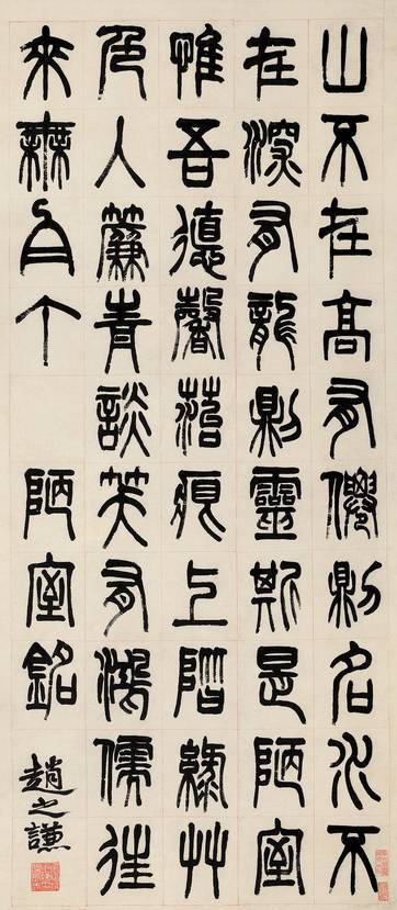 赵之谦是清代著名书画家、篆刻家,与吴昌硕、厉良玉并称“新浙派”的三位代表人物,与任伯年、吴昌硕并称“清末三大画家”。赵之谦的篆刻成就巨大,对后世影响深远。从这篇《陋室铭》可看出,其篆书在邓石如的基础上掺以魏碑笔意,别具一格,章法多变,意境清新的独特风貌。