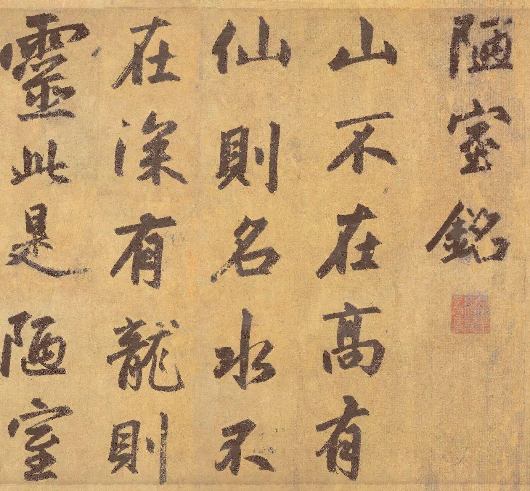 赵孟頫《陋室铭》,行书,纸本,共19行,86字,49*131cm,广东省博物馆藏。全篇字间距稀疏有致,字形扁方,转折处棱角分明,字势宽博开张,笔法坚实厚重,笔力遒劲有力,体现出古朴生拙之美!