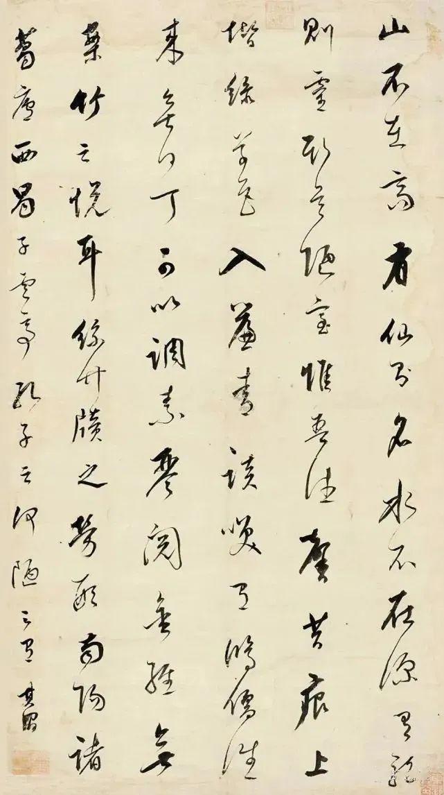 从此篇来看,祝允明笔风接近黄山谷,提按和使转的笔法交互使用,行与行之间的距离很紧,形成一种汪洋恣肆的视觉效果。受黄庭坚影响很大,所以书法有铁画银钩之称,有晋唐人的古雅气息。
