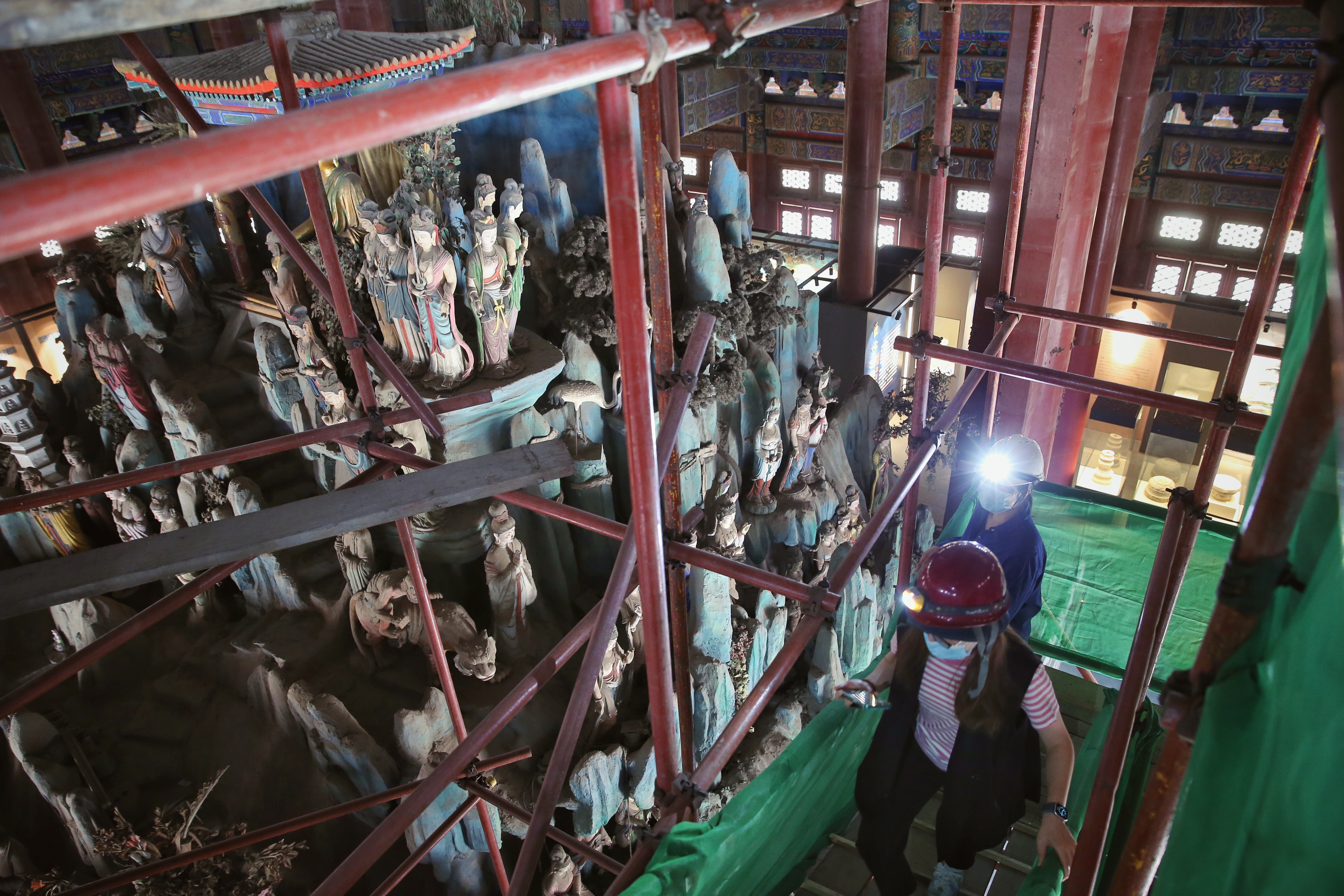 2022年4月20日,北海公园小西天建筑群,工作人员在脚手架上检查大殿内建筑细节。新京报记者 薛珺 摄
