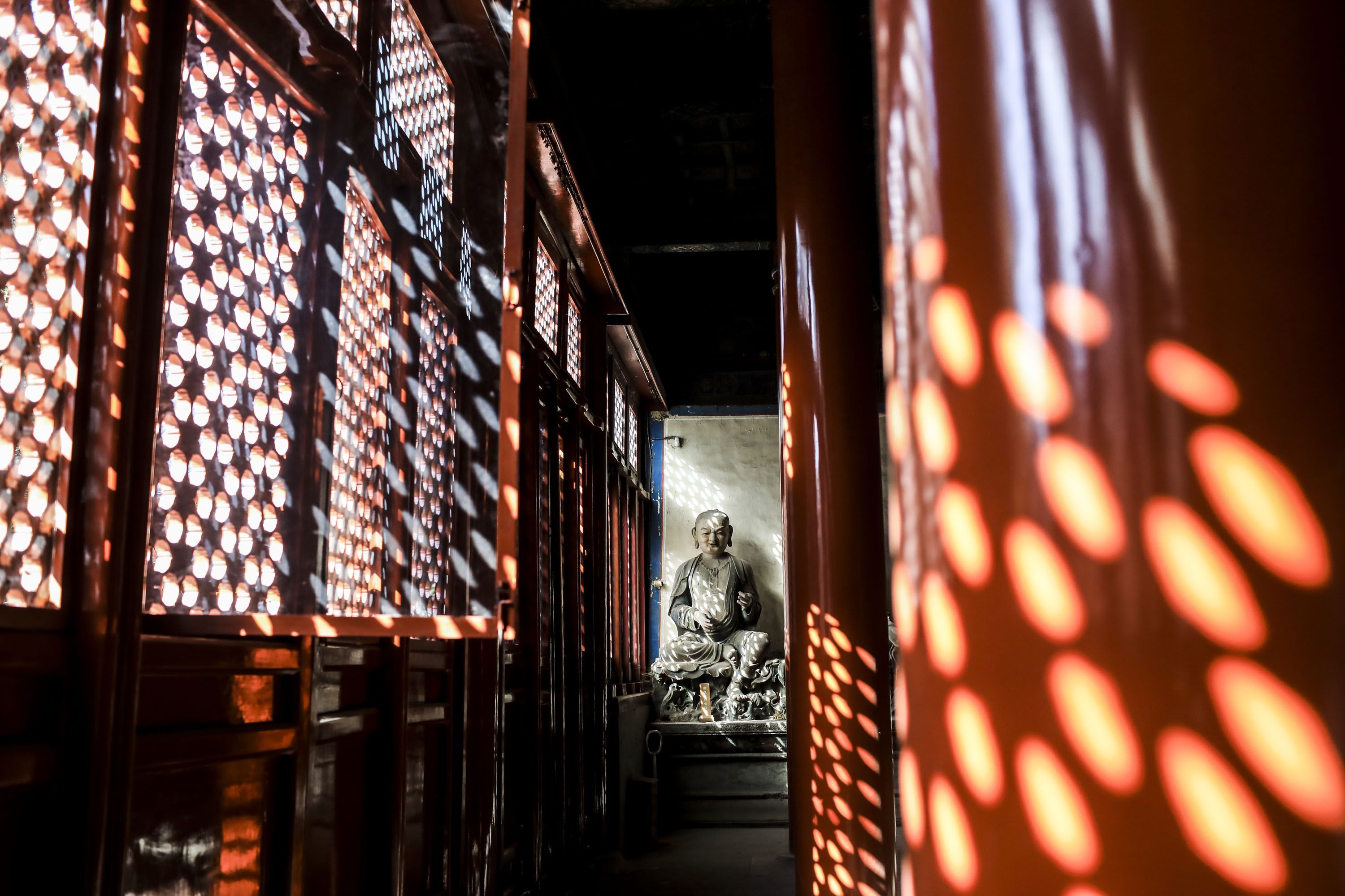 2020年11月12日,万寿寺中路大雄宝殿,一座罗汉木雕造像沐浴在阳光里。新京报记者 浦峰 摄
