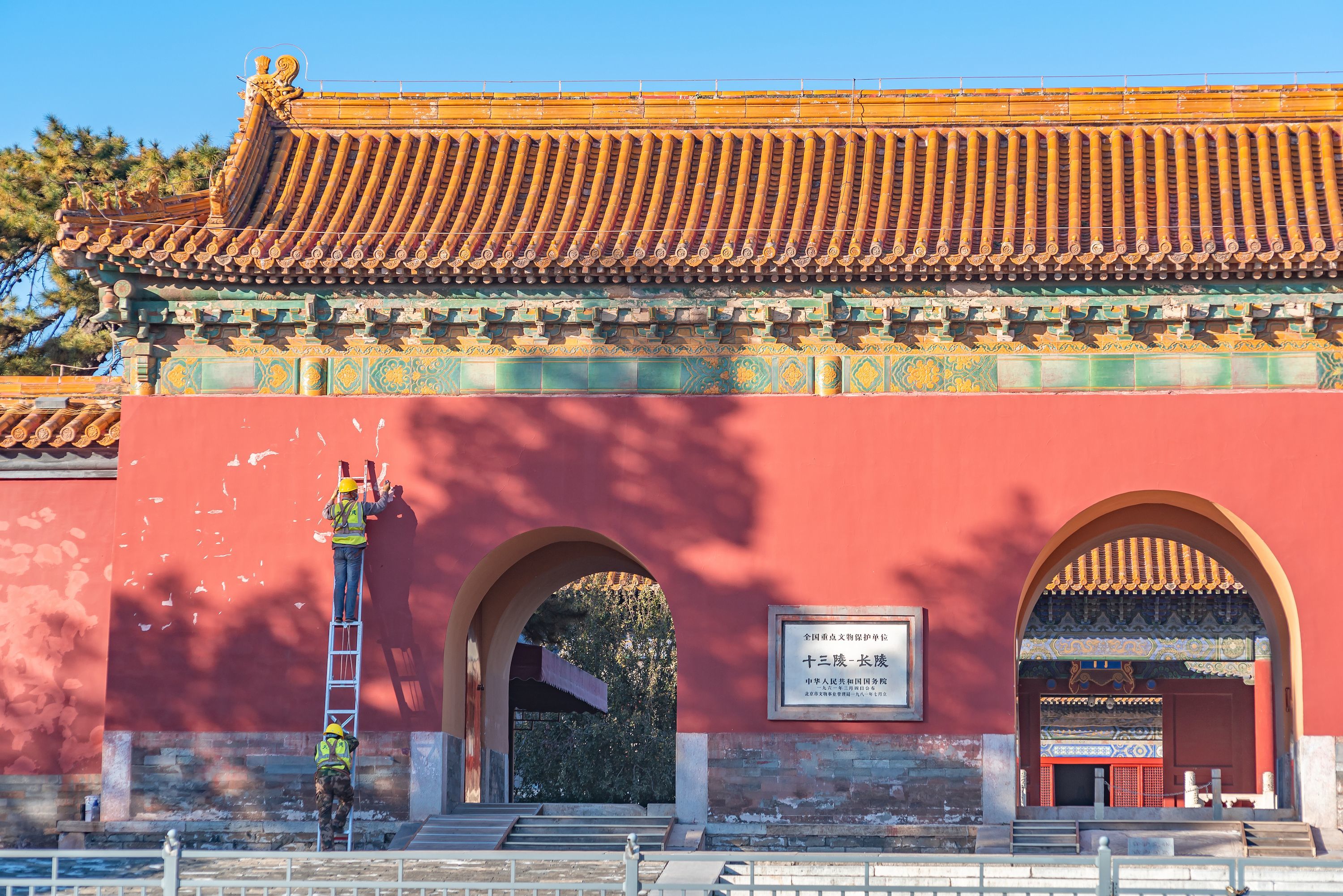 2021年10月26日,北京明十三陵长陵景区,长陵大宫门进行文物修缮,文物古建修缮工作者在进行墙体外立面的修缮工作。图/视觉中国
