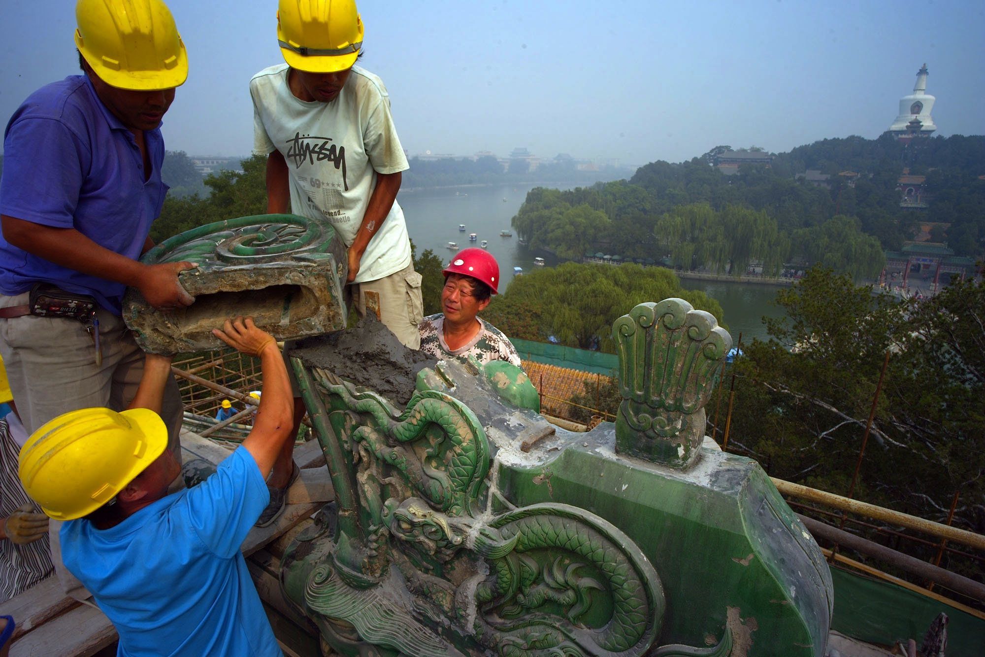 2012年8月26日,北海公园团城,工作人员安装承光殿正脊两端兽吻琉璃构件。新京报记者 薛珺 摄
