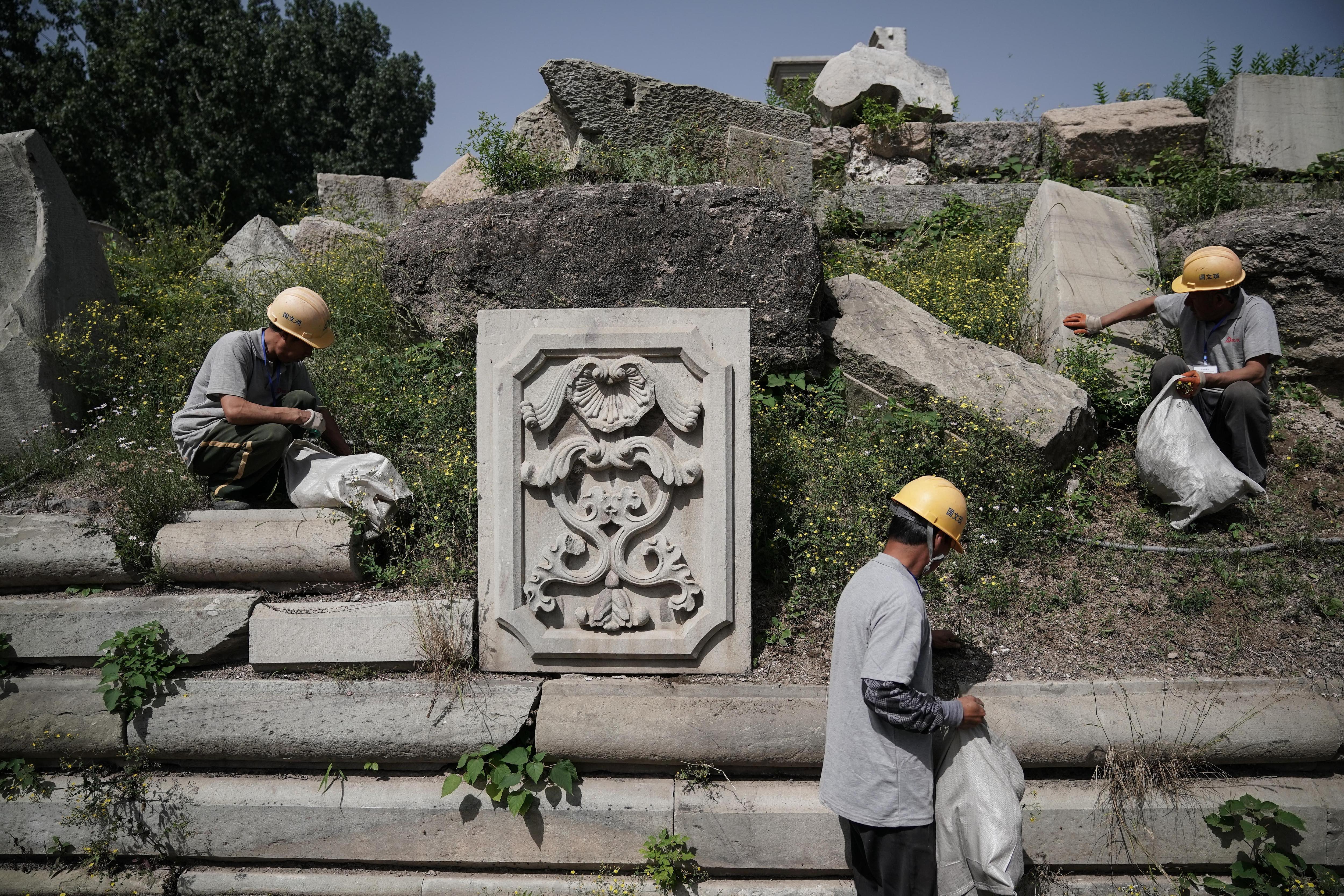 2018年5月23日,圆明园遗址公园启动远瀛观、大水法抢救保护工程。图为工人们进行拔除杂草工作。图/视觉中国